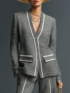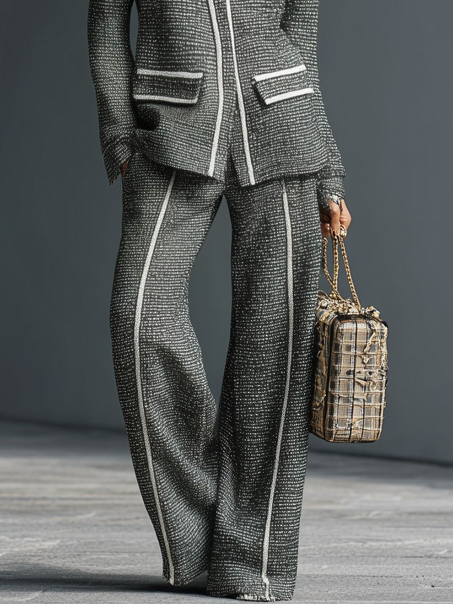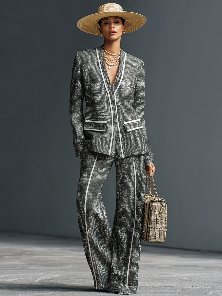 Introducing the Vintage Exquisite Casual Gray Tweed V-neck White Trim Top And Pants Set, a perfect blend of timeless elegance and modern comfort. This ensemble features a sophisticated gray tweed fabric, offering a classic aesthetic with a touch of contemporary style. The V-neck design highlights the neckline, while the white trim adds a subtle contrast that enhances the overall look.