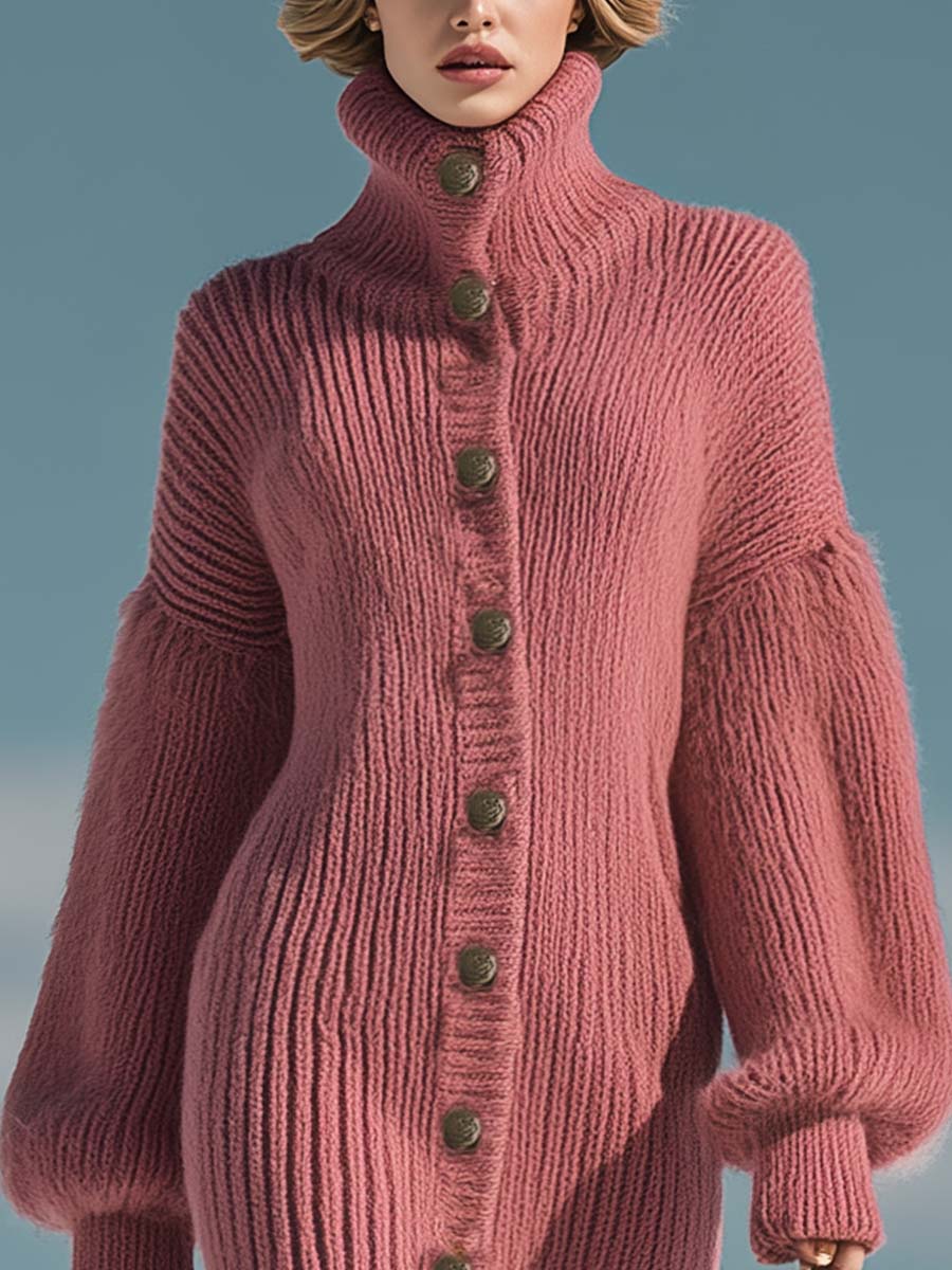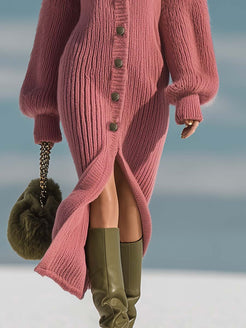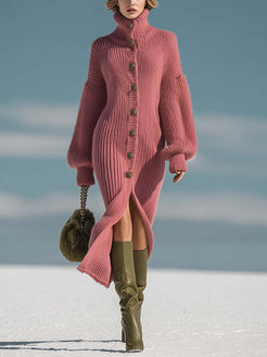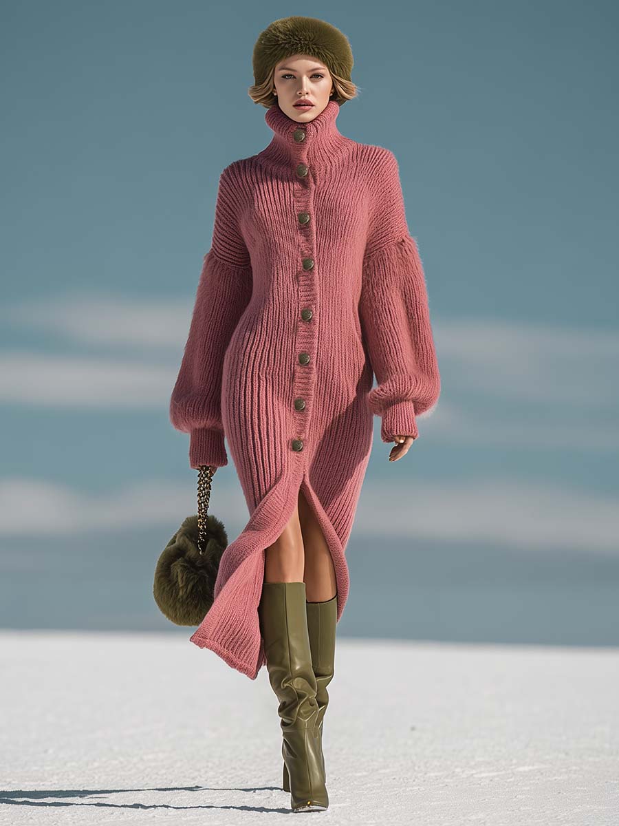 This Autumn and Winter Thick Pink High Collar Front Button Slit Knitted Midi Dress is the perfect blend of style and comfort. Crafted from premium knitted fabric, this dress is designed to keep you warm while exuding a chic elegance. The high collar not only adds a touch of sophistication but also provides additional warmth during the cooler months. The pink hue is both vibrant and timeless, making it a versatile addition to your wardrobe.