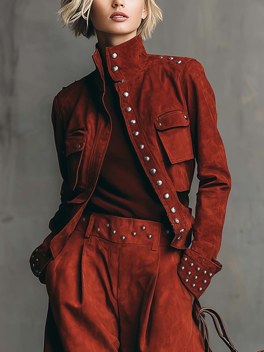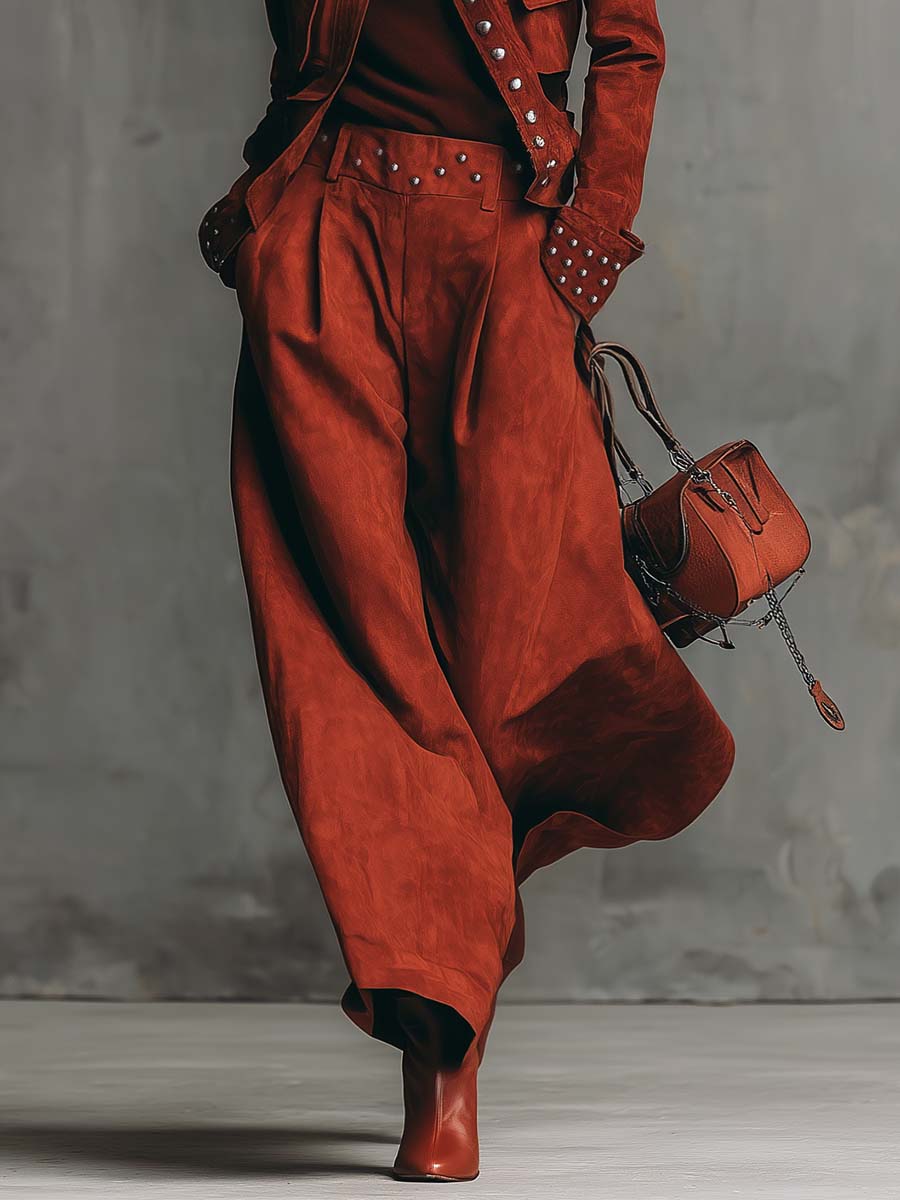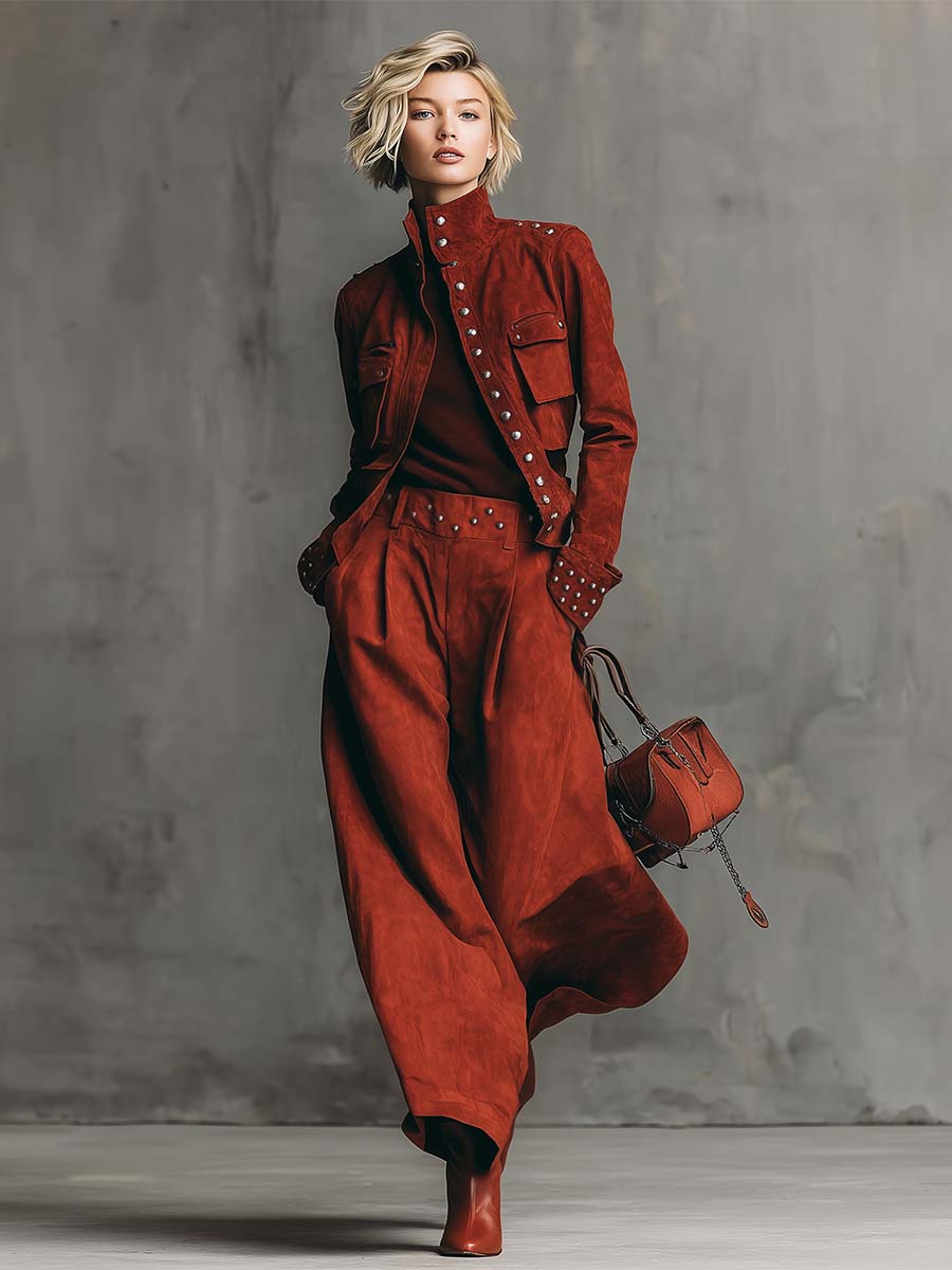 This exquisite retro street style set features a stunning crimson suede jacket and matching wide-leg pants. The jacket is elegantly designed with a unique lapel and adorned with distinctive rivet decorations, creating a timeless yet contemporary look. The wide-leg pants complement the jacket, offering a comfortable yet stylish fit for any fashion-forward individual.