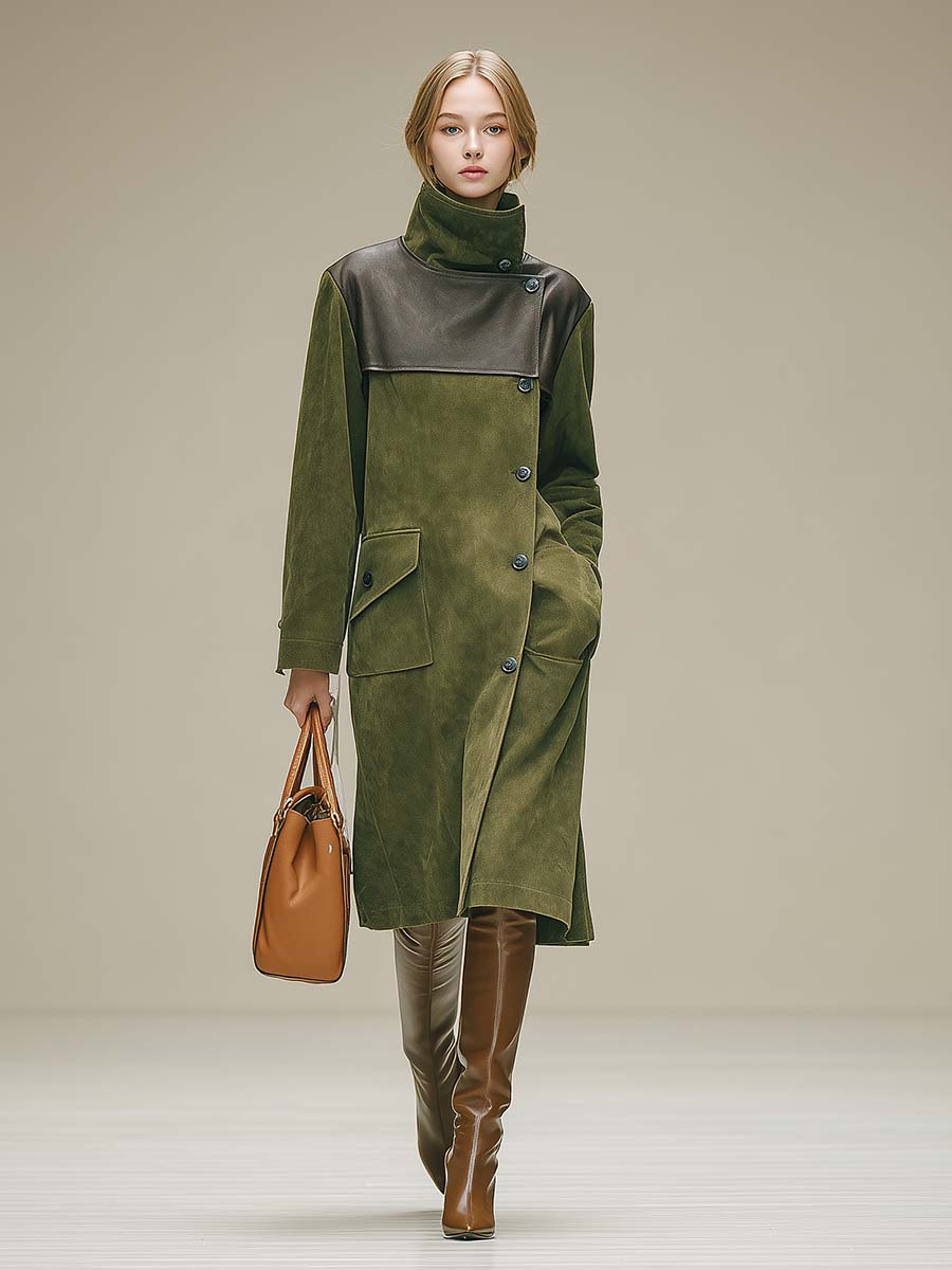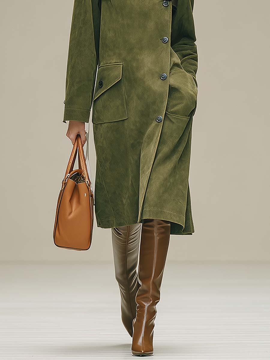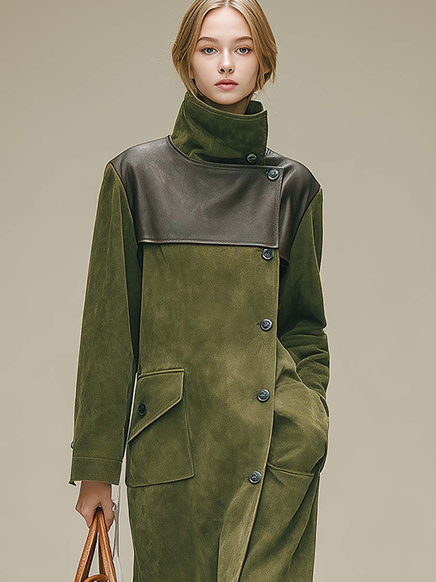 This retro-chic faux suede midi dress features irregular pockets for a clean, sleek look. It's easy to slip on and off, and the leather panels create a stylish and effortless look. The retro green color is simple and sophisticated, perfect for any occasion.