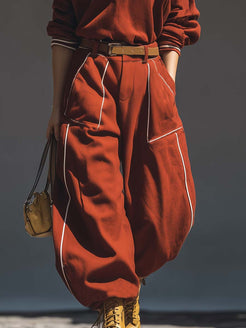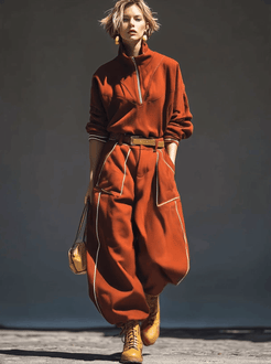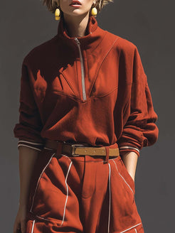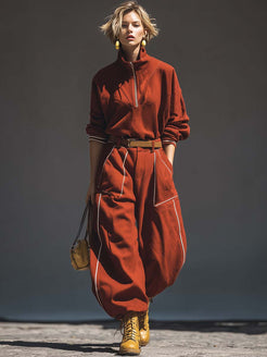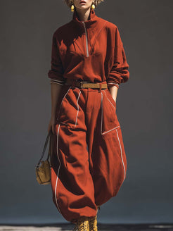 This Retro Fashion Sports Set is a stylish and versatile ensemble that includes a maroon stand collar front zip top and machete pants. The design brings a distinct vintage flair with a modern twist, perfect for fashion-forward individuals seeking comfort and style.