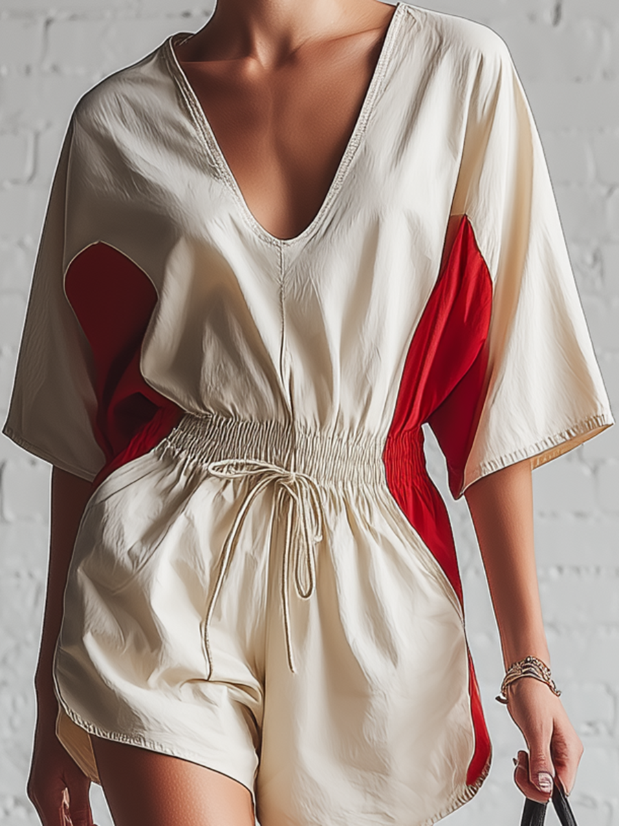 2.Design: Short-sleeved V-neck,drawstring feature,contrasting colors.