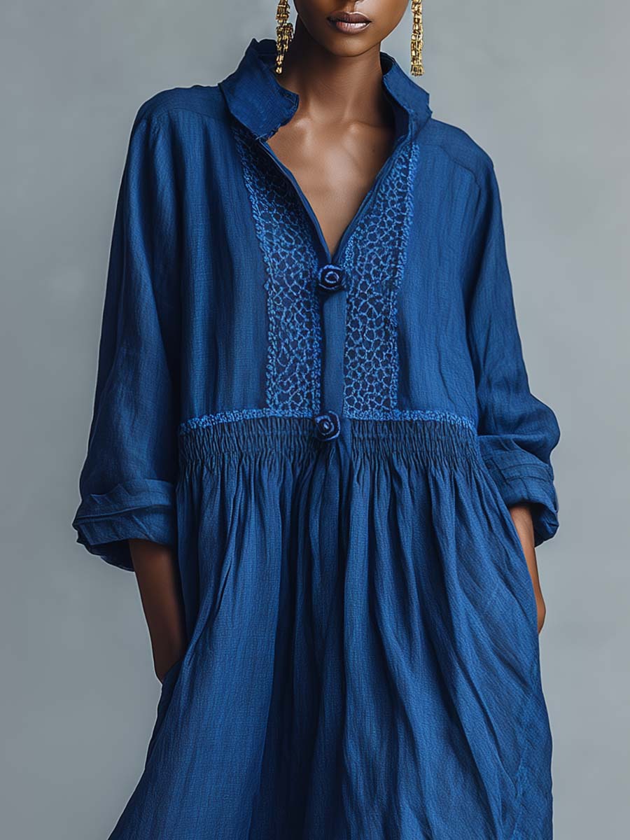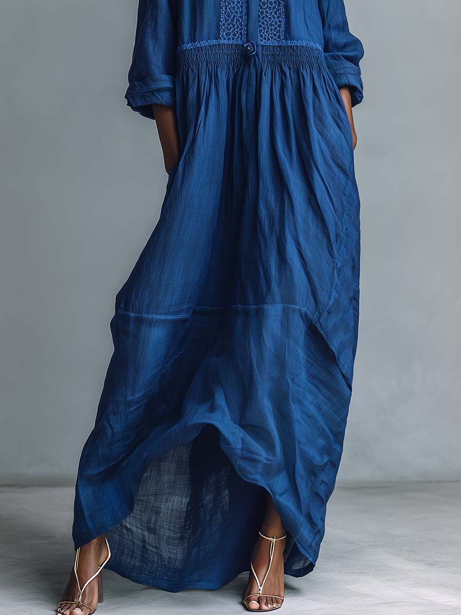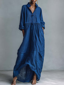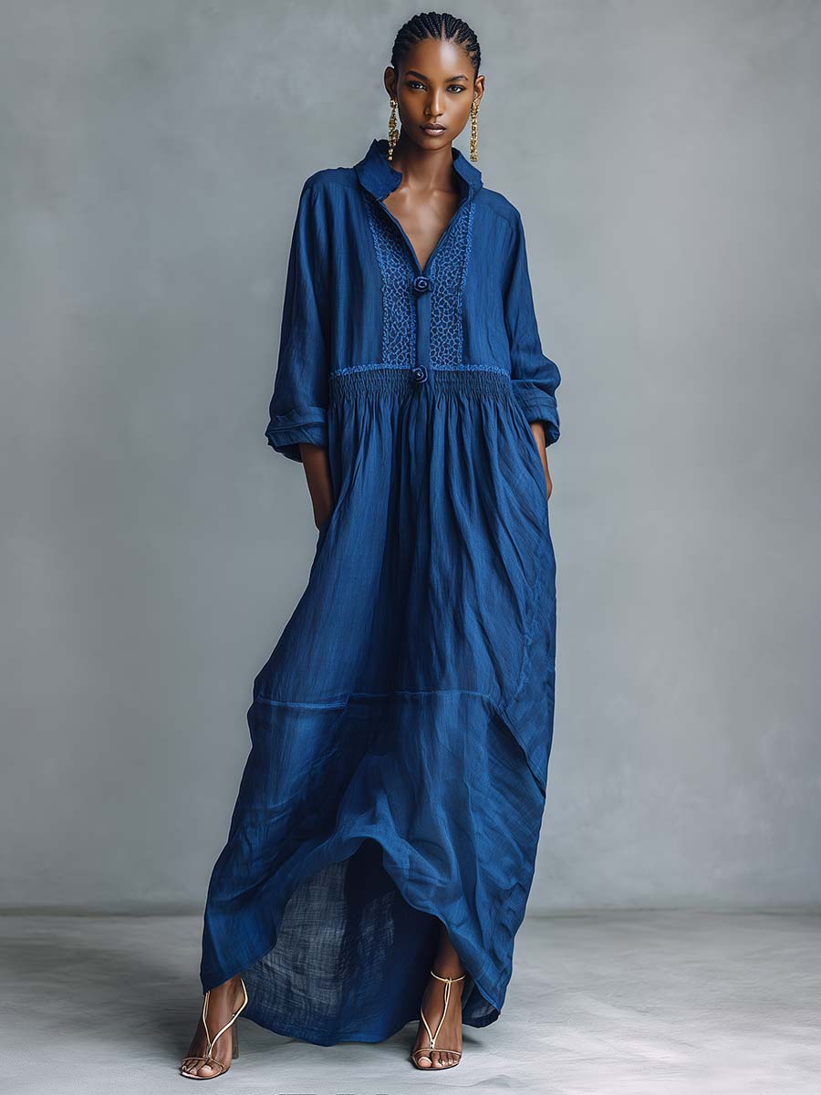 The Vintage Elegant Lapel D Floral Buttons Dark Blue Linen Maxi Dress is a timeless piece that seamlessly blends sophistication with vintage charm. Crafted from premium dark blue linen, the dress features a classic lapel design and intricate floral buttons that perfectly adorn its front, creating a subtle yet striking vintage appeal.