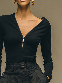 The Simple Urban All-match V-neck Zipper Black Stretch Cotton Shirt Top is a versatile wardrobe essential designed for the modern fashionista. Made from high-quality stretch cotton, this shirt ensures both comfort and style throughout the day. Its sleek black color and classic V-neck design make it a timeless piece suitable for various occasions.