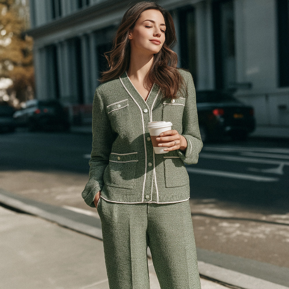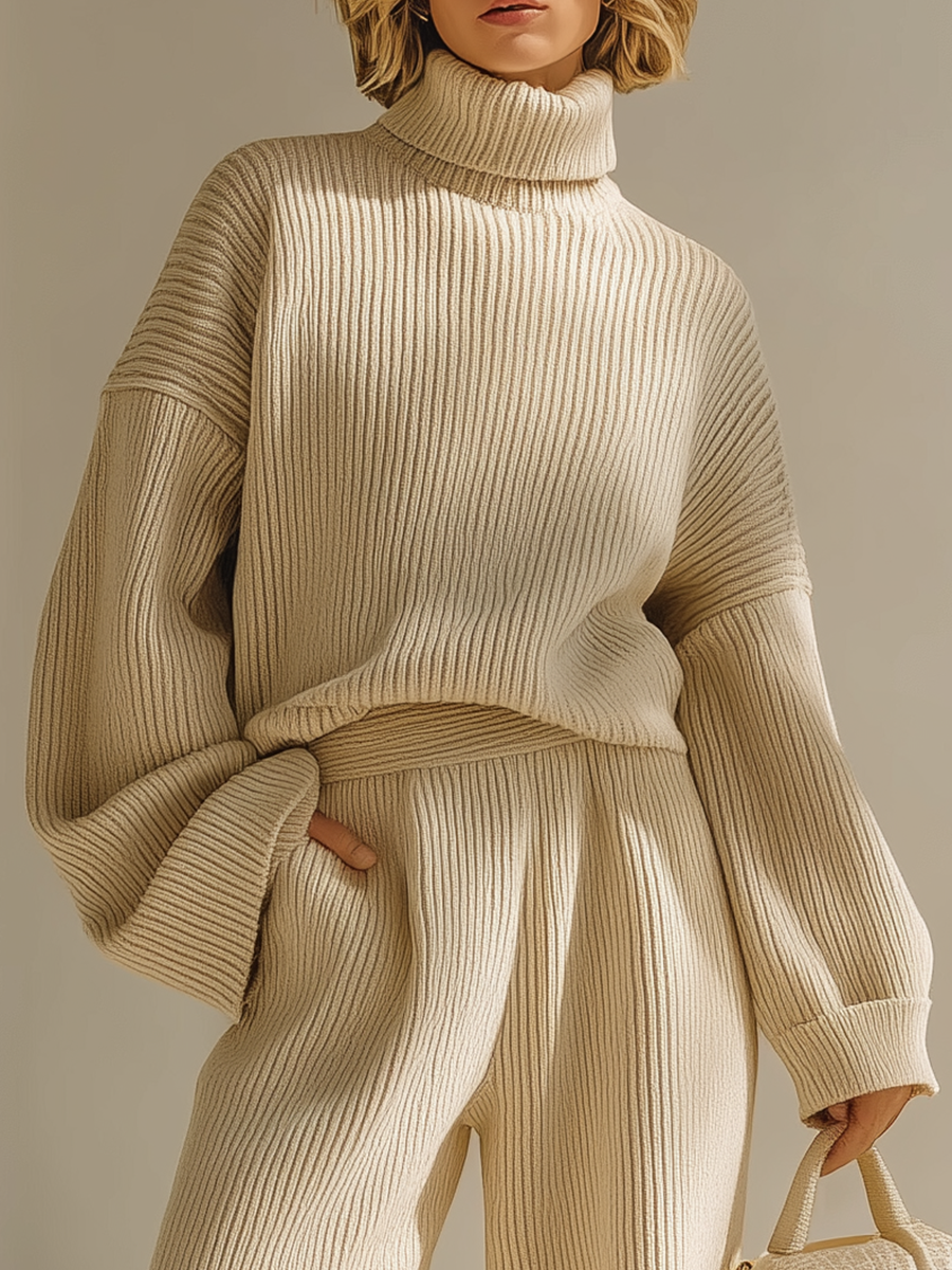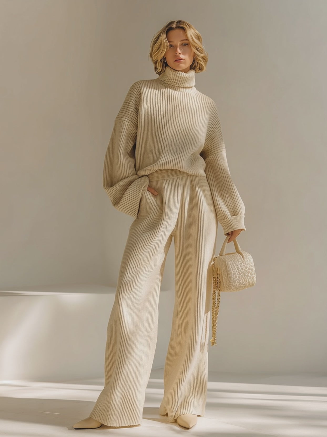 The casual and comfortable stand-up collar sweater and wide-leg pants set is a modern ensemble that effortlessly blends ease with style. This set is perfect for those who prioritize comfort but still want to maintain a polished appearance. The stand-up collar sweater, often made from soft, cozy materials like cotton or a knit blend, provides warmth while adding a subtle touch of sophistication. The stand-up collar offers a bit of structure to the relaxed fit, framing the face elegantly and making it suitable for various casual settings. Its design is typically simple yet chic, allowing it to be worn on its own or layered under jackets and coats.