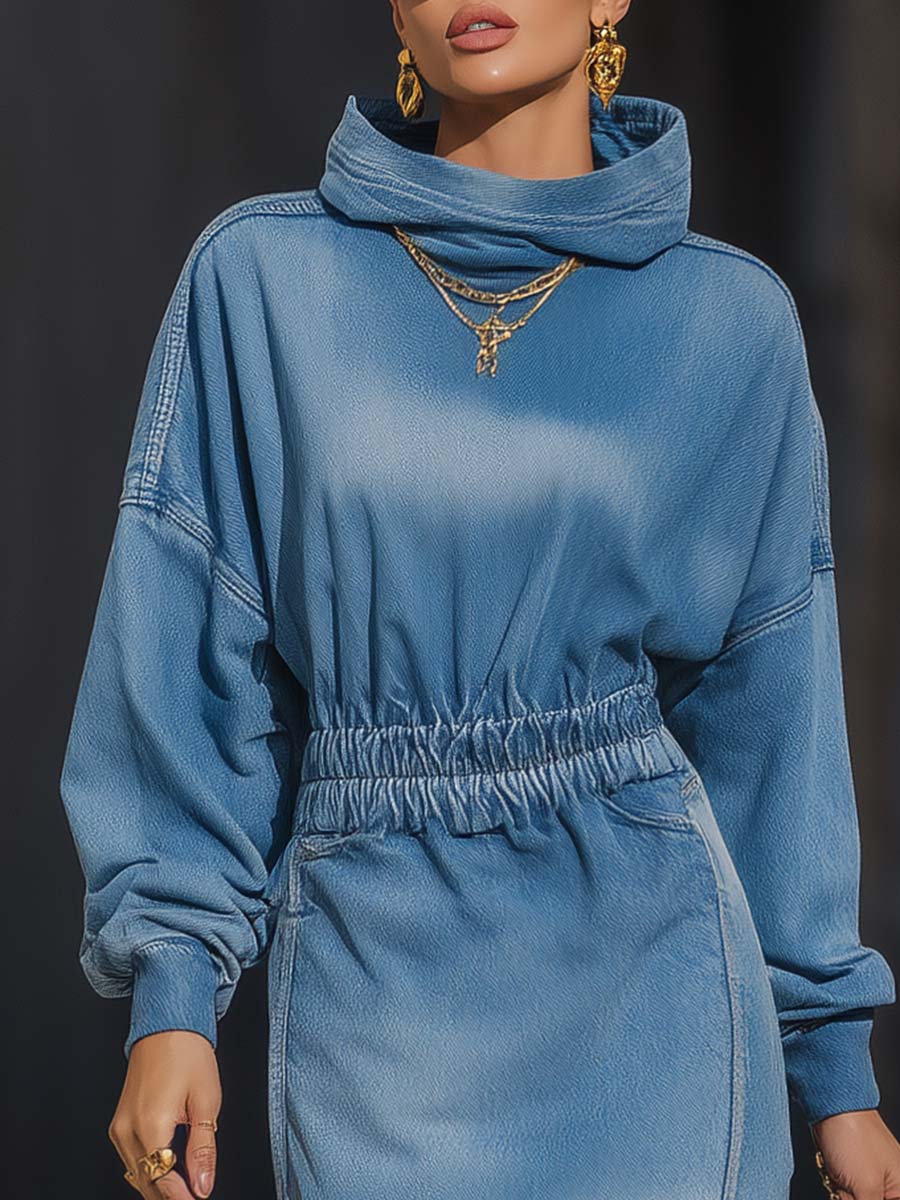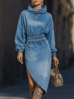 Introducing our Casual Fashion Hooded Denim Midi Dress, a stylish and versatile piece perfect for any casual outing. The dress features a comfortable elastic waist that enhances your shape while ensuring a snug fit. The asymmetrical hemline adds a modern edge, making this dress a standout item in your wardrobe. Its unique bat sleeves contribute to a relaxed yet chic look, perfect for those who appreciate both comfort and style.
