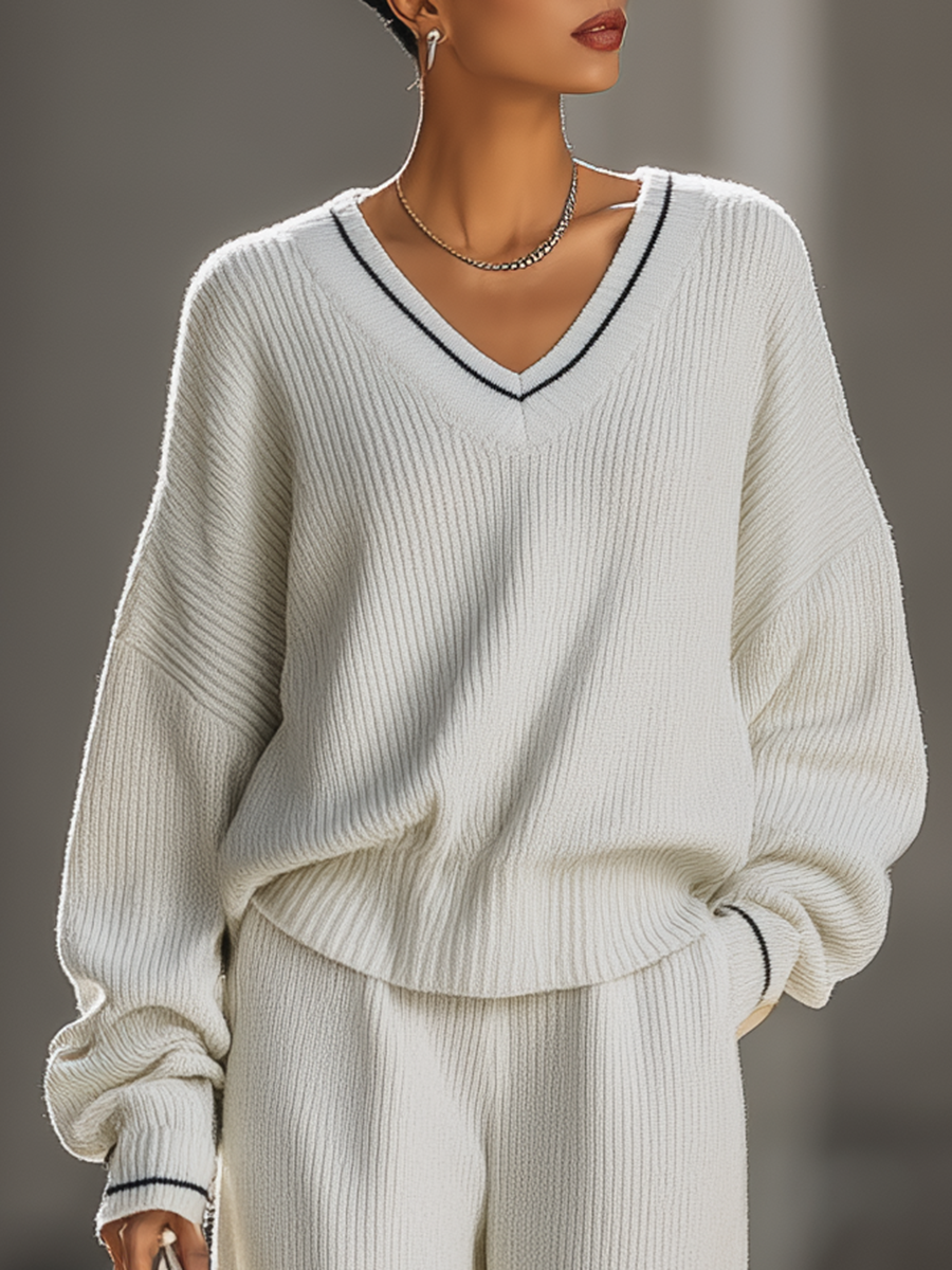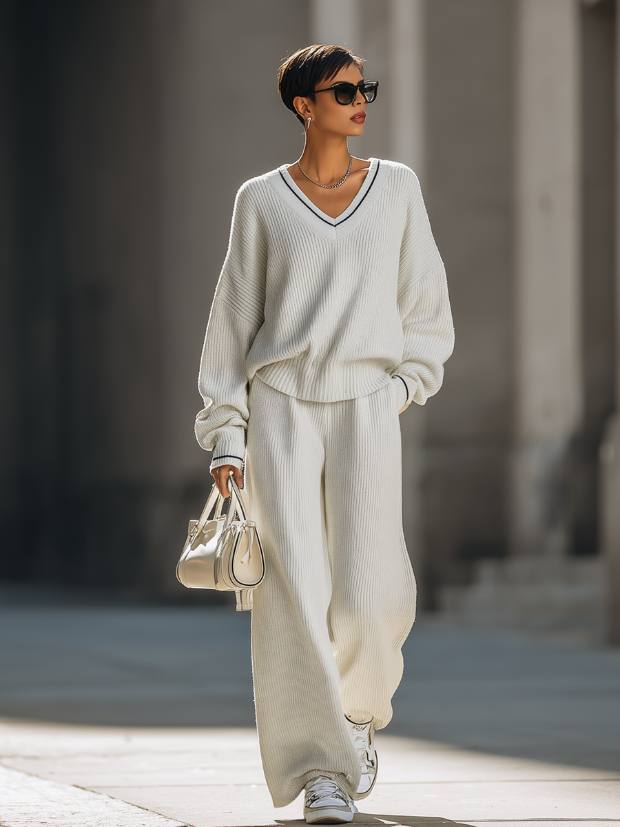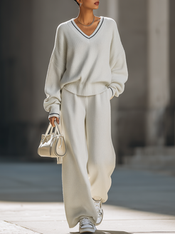Paired with wide-leg pants, this set embodies a sense of effortless sophistication. The wide-leg pants offer a flowy, relaxed fit that not only enhances comfort but also adds a fashionable edge to the overall look. Typically crafted from soft, breathable fabrics, the pants drape elegantly, creating a graceful silhouette that pairs well with the loose sweater. To style this set, you can add a pair of comfortable sneakers or ankle boots for a grounded, everyday vibe. Accessorize with minimalist jewelry, such as hoop earrings or a delicate necklace, to maintain its understated charm. A crossbody bag or a tote can complete the ensemble, offering functionality and style. This casual loose V-neck sweater and wide-leg pants set is perfect for those who appreciate a blend of comfort and style, providing a versatile outfit that transitions seamlessly from relaxing at home to casual errands or relaxed social gatherings.