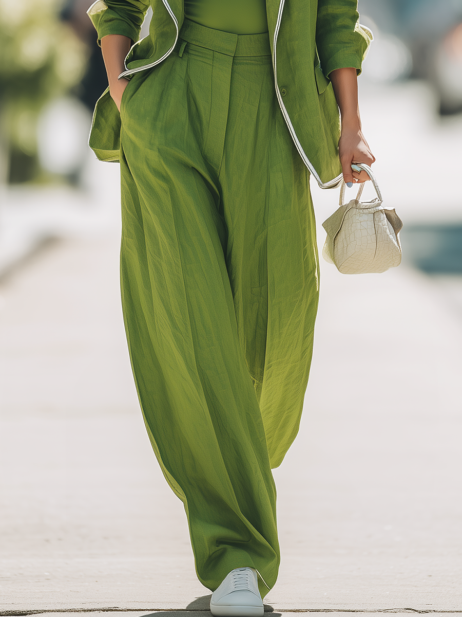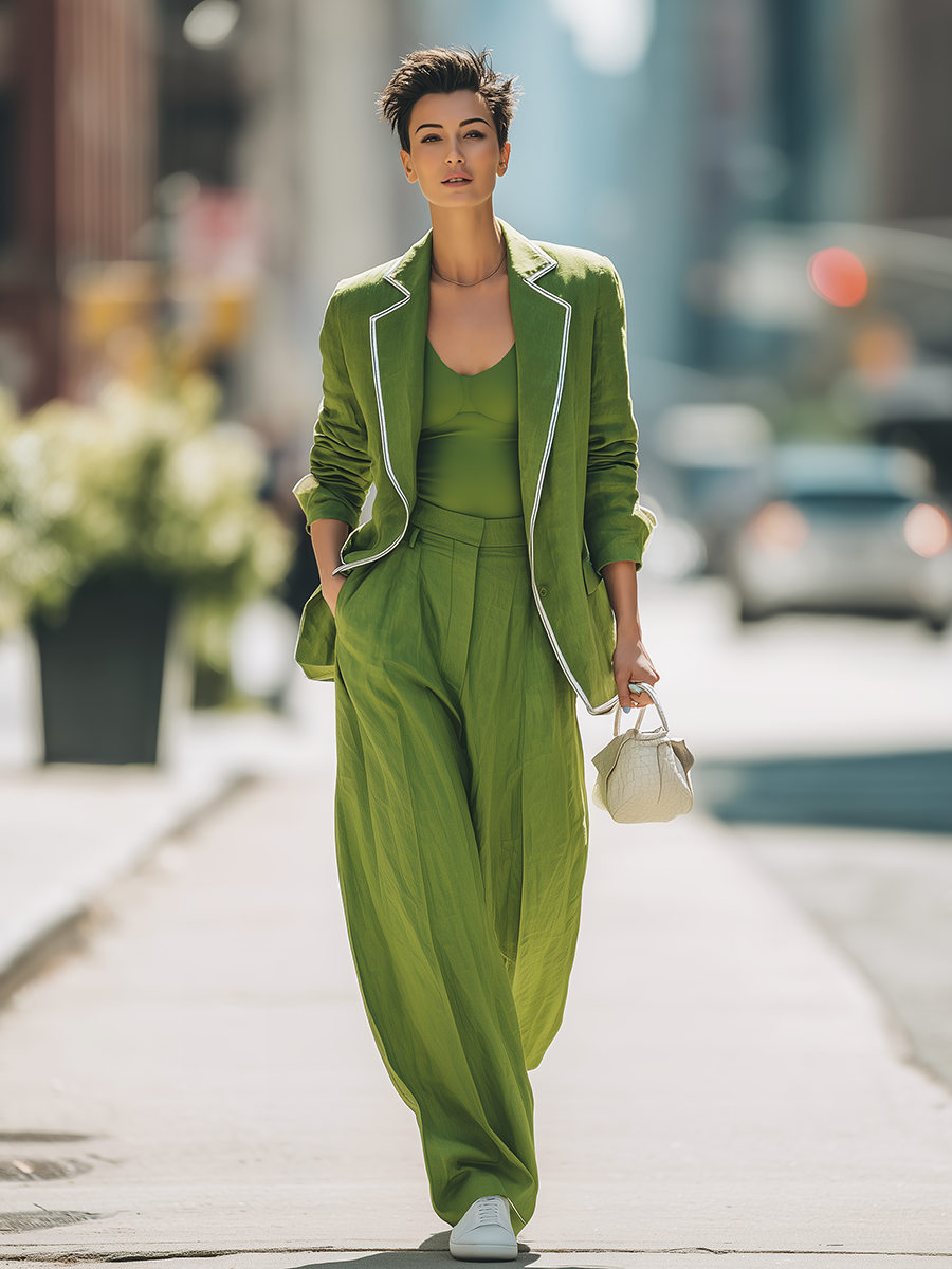 The casual stylish silver trim blazer and wide-leg pants set is a contemporary and chic ensemble that effortlessly combines laid-back elegance with a touch of sophistication. The blazer features a relaxed silhouette with striking silver trim detailing along the lapels or cuffs, adding a modern twist to a classic design. Made from a comfortable blend of fabrics, this blazer is perfect for both casual outings and semi-formal events. The wide-leg pants are designed to complement the blazer, providing ease of movement and a flattering silhouette that drapes beautifully.
