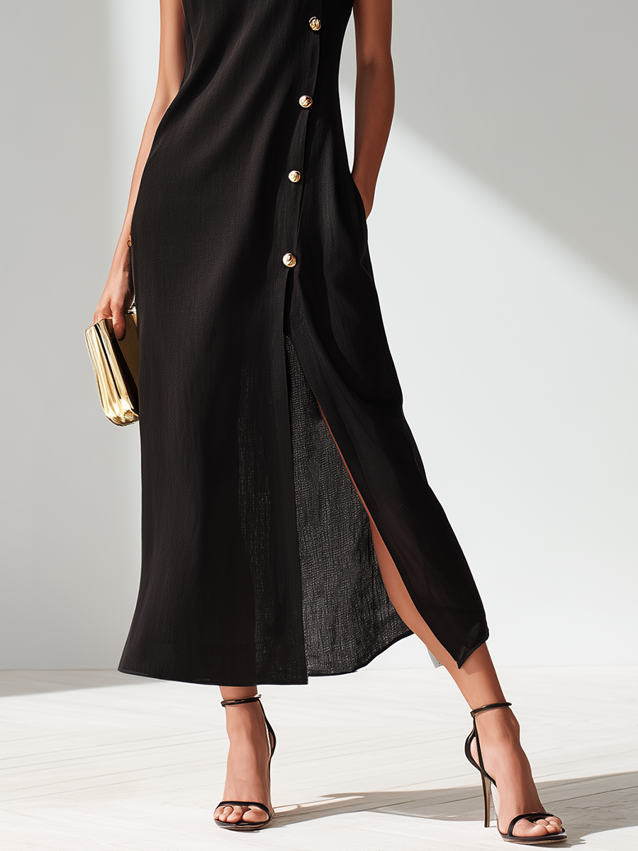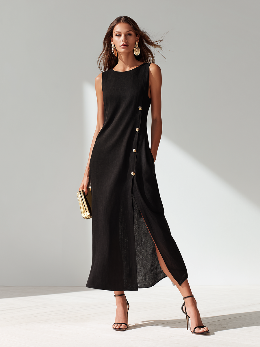 This elegant midi dress perfectly blends casual style and vintage aesthetics. Made from a high-quality cotton and linen blend fabric, it's breathable and comfortable, suitable for various occasions. The dress features a delicate slit on one side and is adorned with unique metal button details, showcasing a classic yet modern charm.