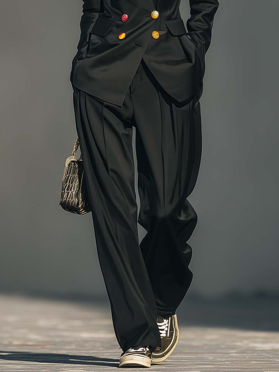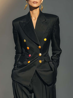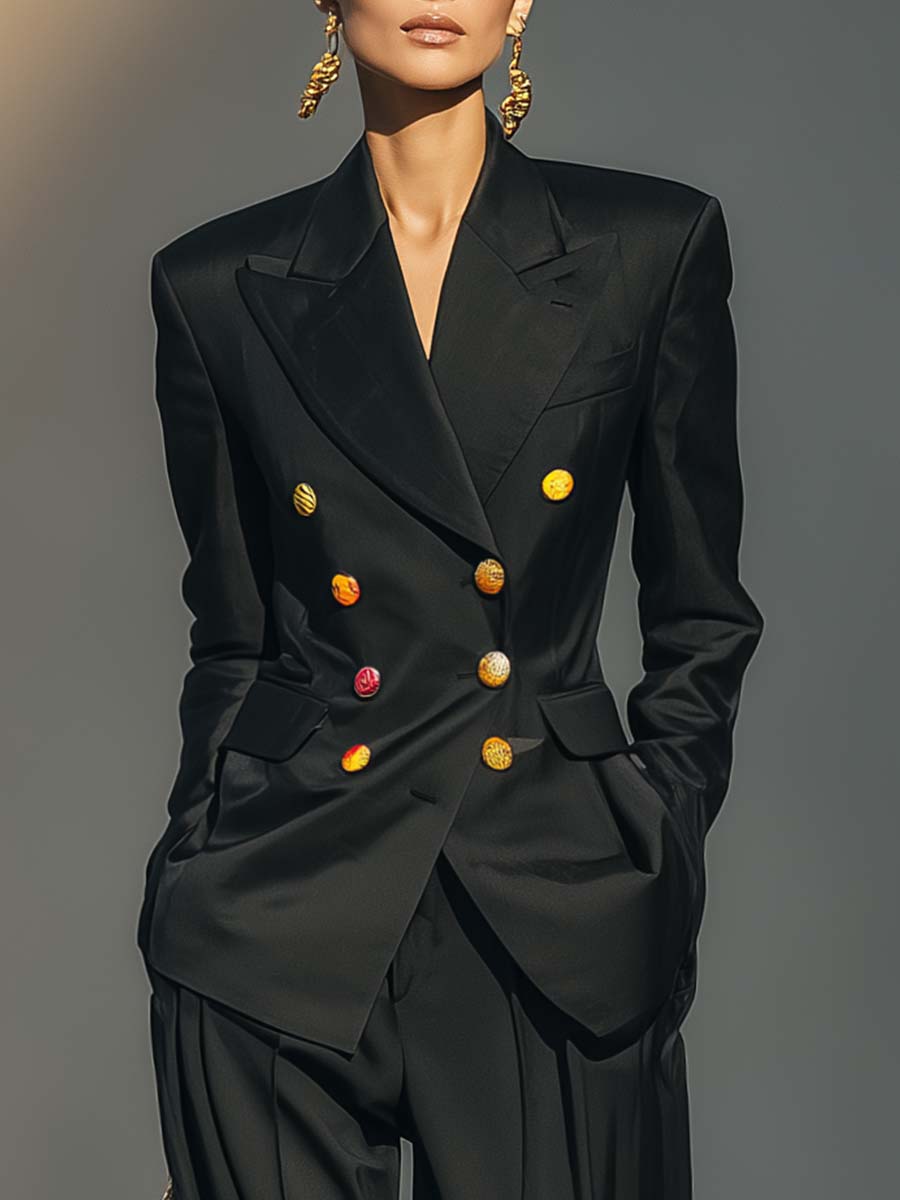 1.Material: Peaked lapels, double-breasted buttons, colorful accents, and a small X-cut silhouette.