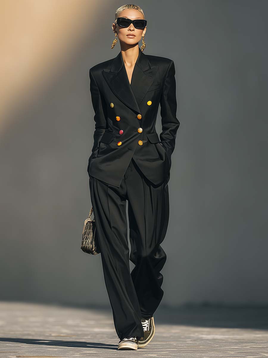 This stylish ensemble, titled "Classic And Unique Urban Black Satin Peak Lapel Colorful Double-breasted Blazer And Trousers Suit," is a stunning choice for the fashion-forward individual who desires a sophisticated yet vibrant look. This set includes a double-breasted blazer featuring a luxurious satin peak lapel and vibrant colorful elements, paired with matching trousers.