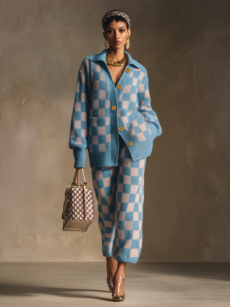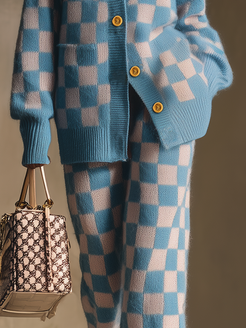 Introducing our classic retro-chic blue knit plaid stretch pants, a perfect blend of timeless style and modern comfort. These pants feature a chic plaid pattern in elegant blue tones, adding a stylish and versatile piece to your wardrobe.