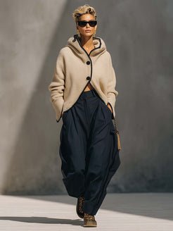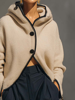 Introducing the Comfortable and Fashionable Urban Black Trim Front Button Hooded Beige Knitted Cardigan, a stylish yet cozy addition to your wardrobe. This cardigan combines elegance with comfort, providing the perfect layering piece for any outfit. Crafted from high-quality knit material, it promises warmth and durability, making it an ideal choice for cooler days.