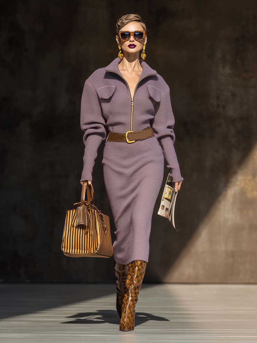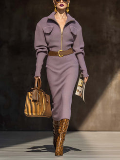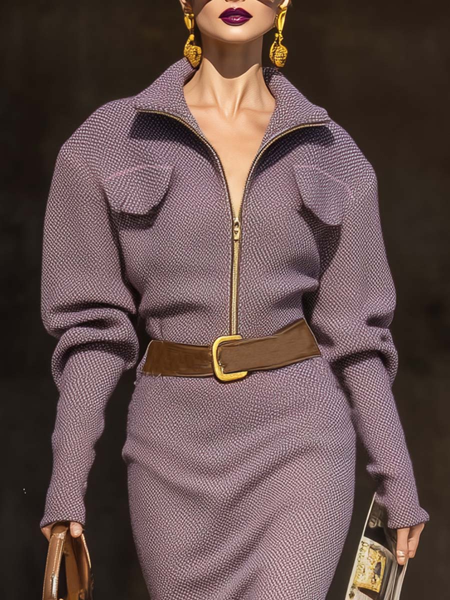 Introducing the Elegant Retro Exquisite Lapel Front Zipper Leg Of Mutton Sleeves Purple Tweed Midi Dress, a stunning addition to your wardrobe that effortlessly marries vintage charm with modern sophistication. This dress, crafted from high-quality tweed fabric, showcases a perfect purple hue that exudes an air of regality and grace, making it suitable for various occasions.