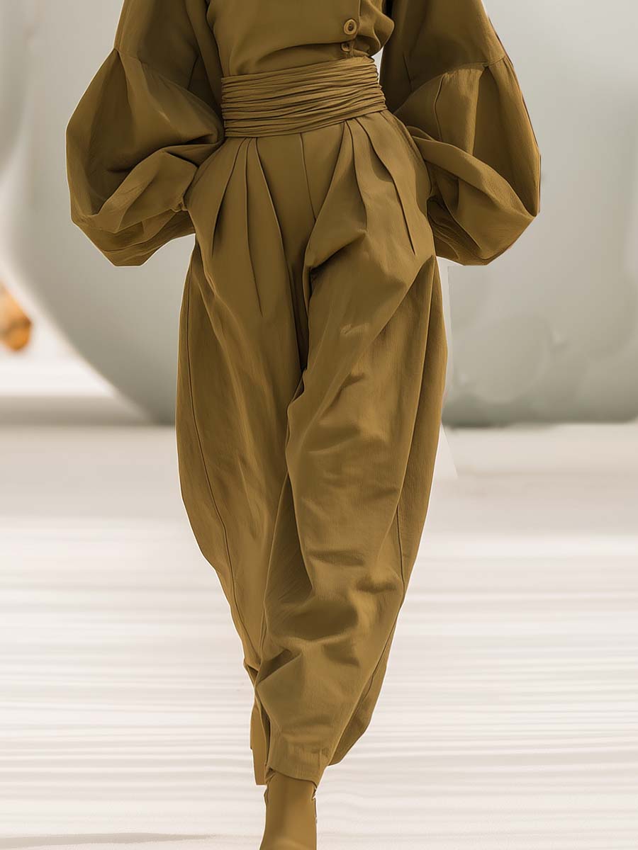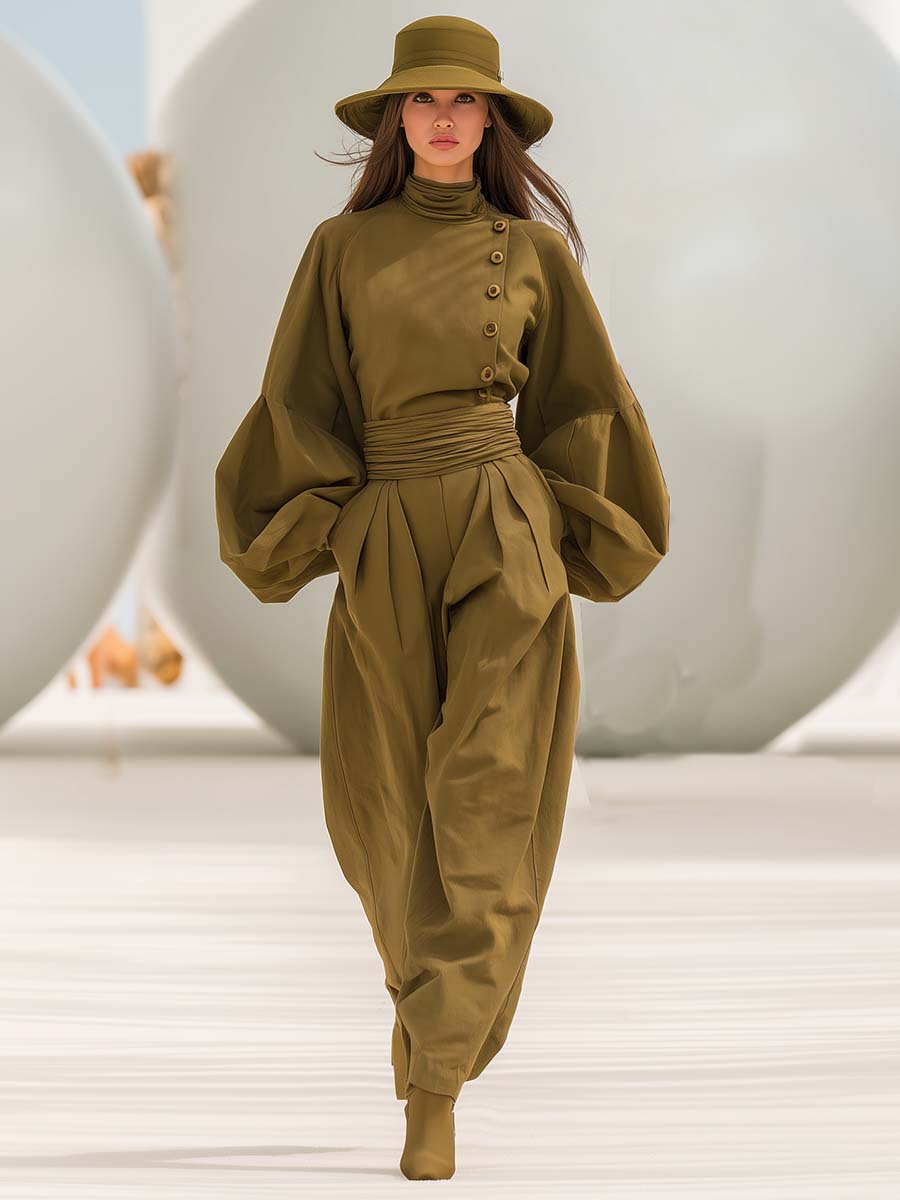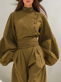 The Elegant Retro Olive Green Oblique Button Super Loose Lantern Sleeve Top and Tapered Pants Set is an exquisite ensemble that combines vintage charm with modern complexities. Made from high-quality fabric, this set includes a striking lantern sleeve top with a unique oblique button front design, paired with chic tapered pants that enhance the overall silhouette. The timeless olive green hue adds a subtle touch of elegance suitable for various occasions.