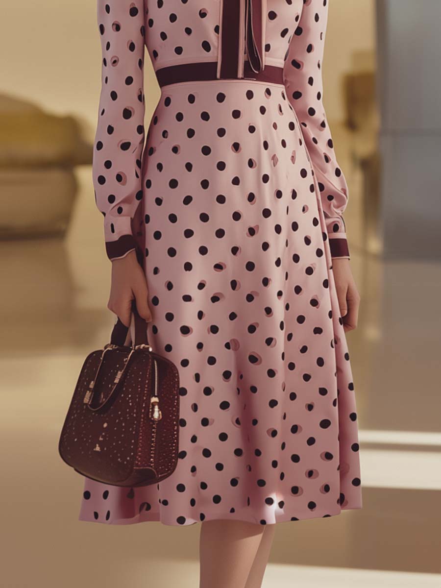 2.Design: Classic polka dot print, tie-down neckline, long sleeves.