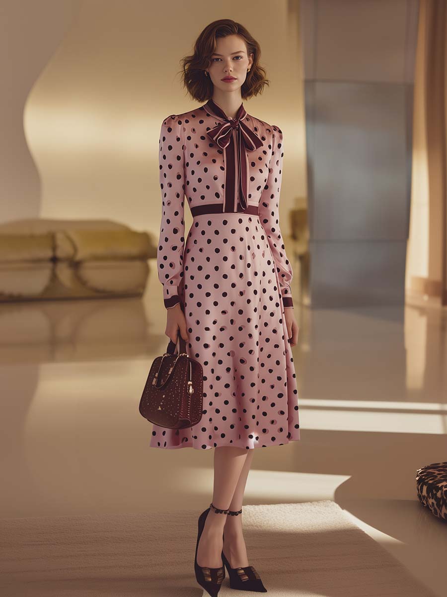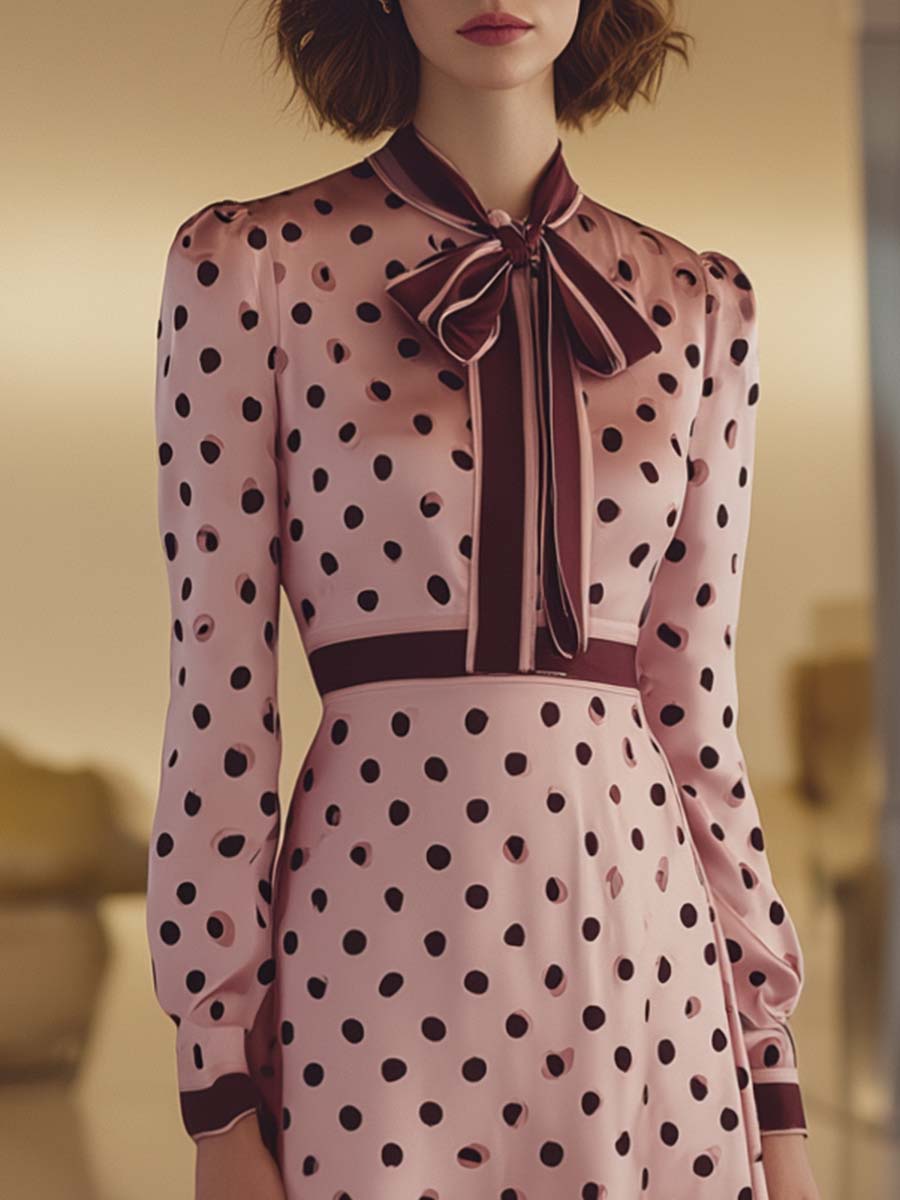 The Elegant Retro Pink Satin Polka Dot Print Tie-neck Long-sleeved Midi Dress beautifully merges vintage charm with modern elegance. Crafted from soft satin, this dress boasts a delicate polka dot pattern and is finished with a classic tie-neck, making it a perfect choice for any fashion-forward wardrobe.