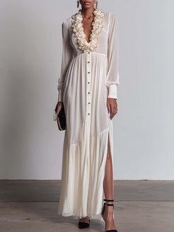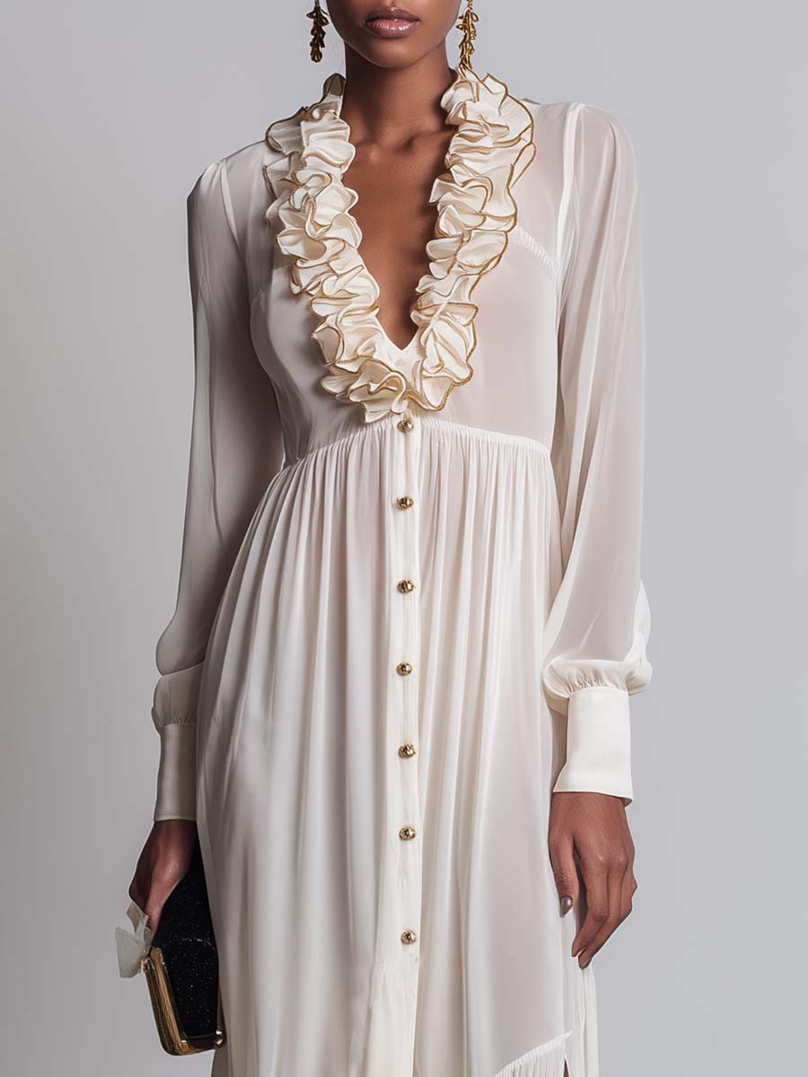 The Elegant Retro Ruffled V-neck Front Button Pearl White Chiffon Slit Maxi Dress is a stunning apparel piece designed to yield a timeless elegance. This dress exudes vintage charm with its sophisticated design elements, making it a must-have for various occasions.