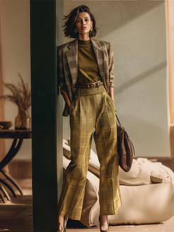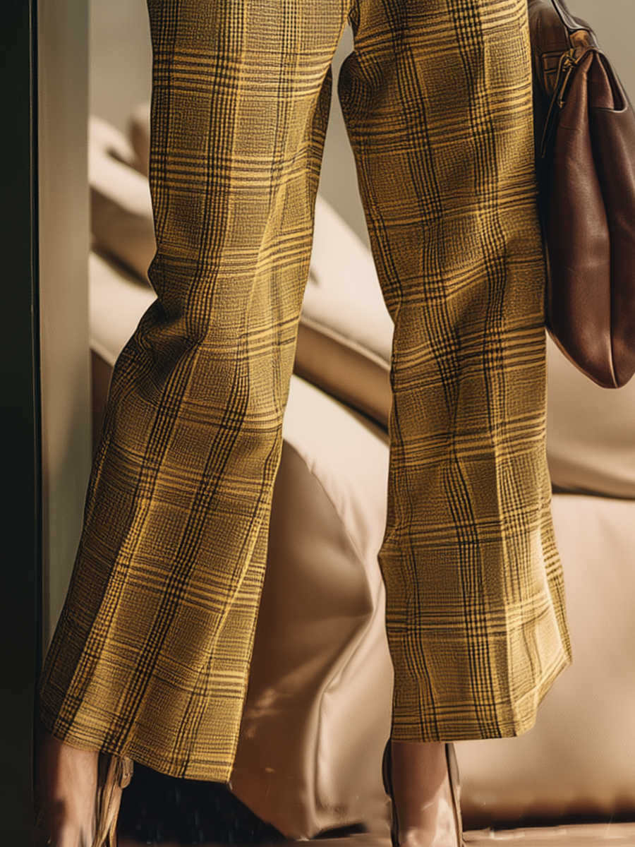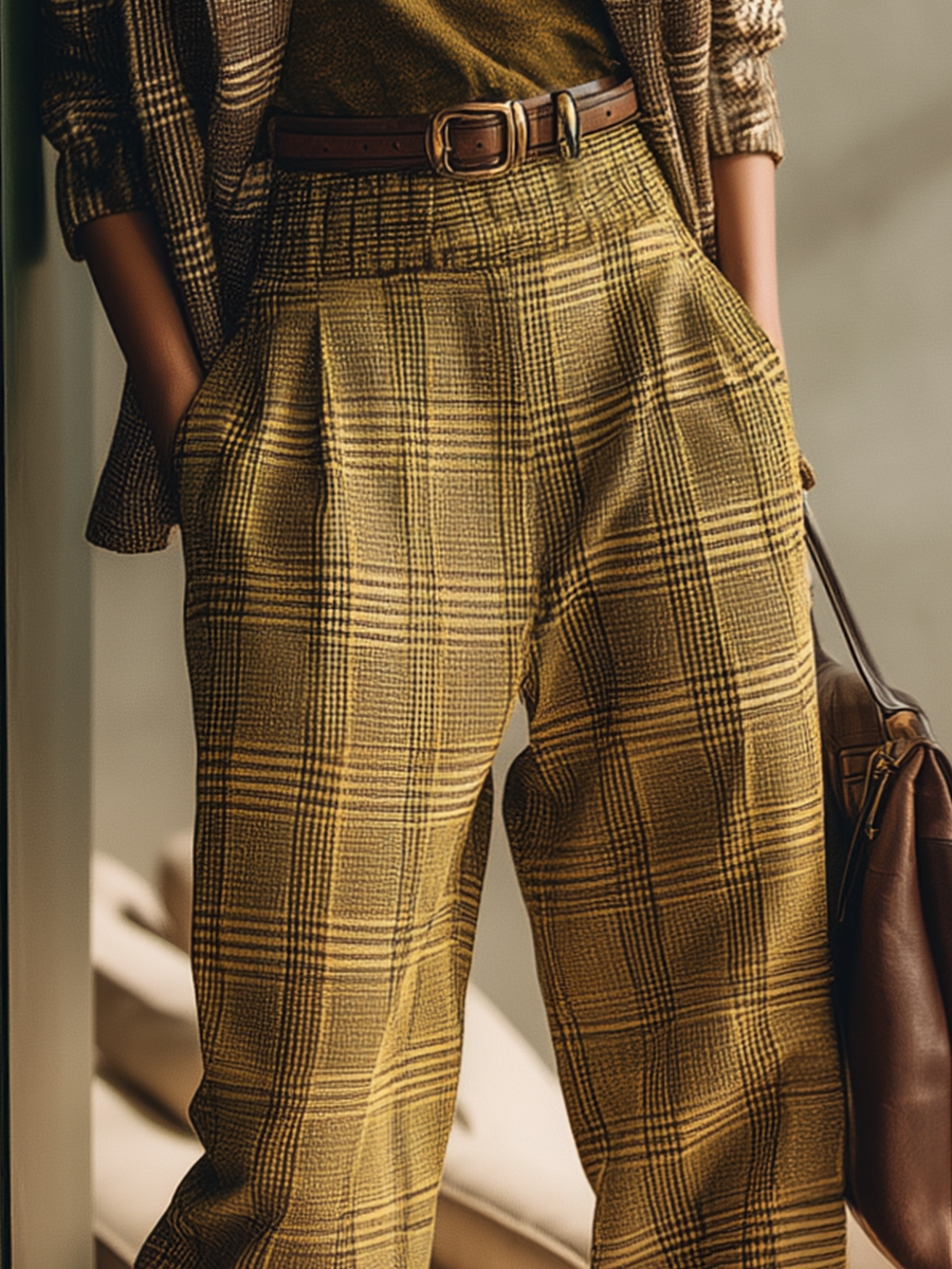 Discover timeless style with our Elegant Retro Versatile Elastic Waist Yellow-brown Plaid Straight-leg Pants. These pants bring together a classic yellow-brown plaid pattern with modern comfort, ensuring you stand out in any setting.
