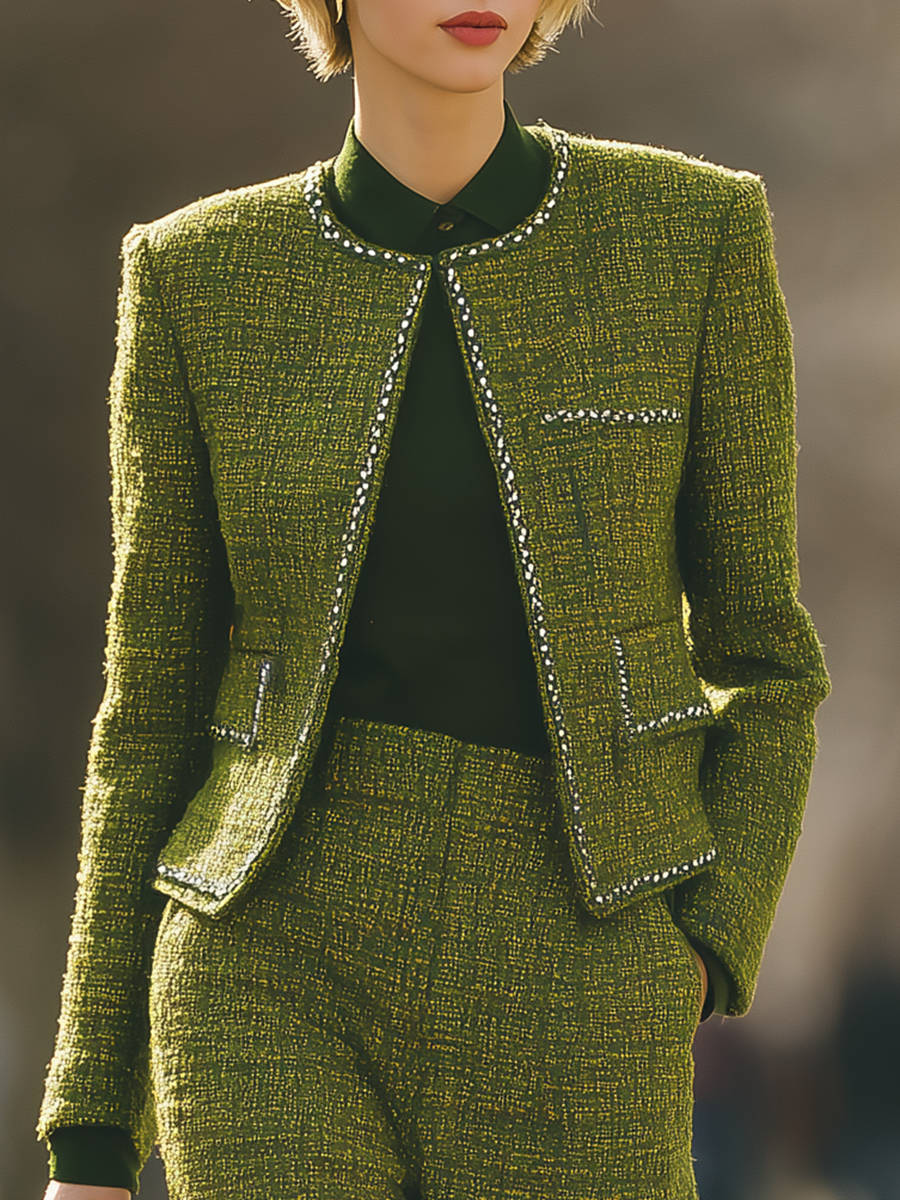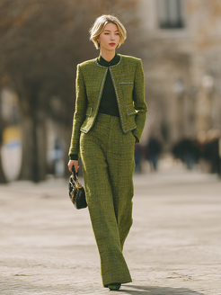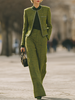 Complementing the jacket, the wide-leg pants offer a modern balance to the timeless appeal of tweed. These pants are designed to flow gracefully from the waist, providing both comfort and a flattering silhouette that elongates the legs. The wide-leg style embodies a chic, relaxed vibe while maintaining a polished look suitable for the workplace or sophisticated social events. This set, when worn together, creates a harmonious blend of structure and fluidity, allowing for versatile styling options. Pair it with sleek heels for a more formal occasion, or opt for ankle boots for an elegant daytime look. The combination of the round-neck tweed jacket and wide-leg pants ensures a stylish, cohesive outfit that is perfect for making a classy statement.