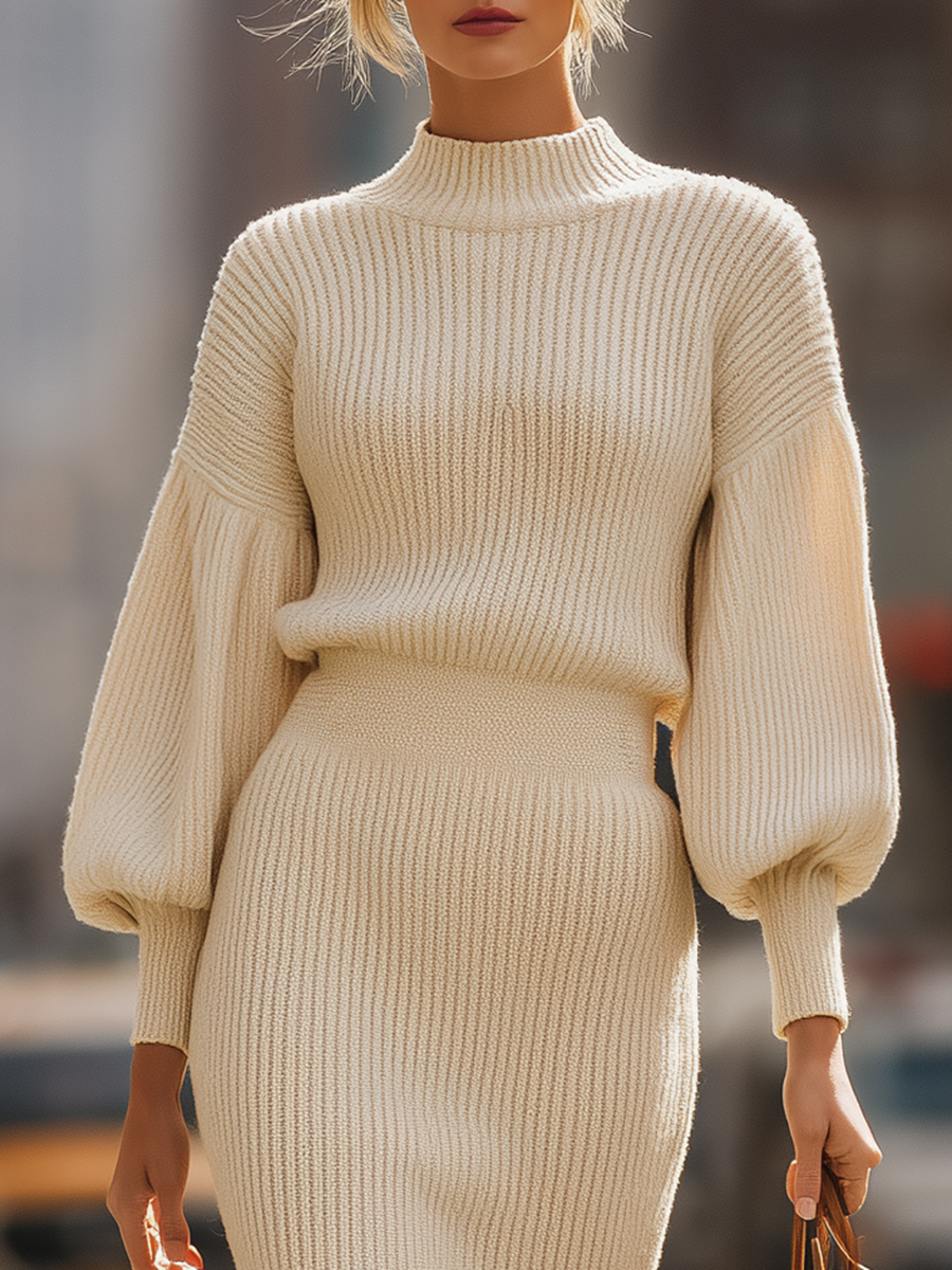 The elegant simple stand-up collar lantern sleeve knitted dress is a fashion-forward piece that combines subtle sophistication with contemporary style elements. This dress typically features a stand-up collar, which adds a touch of refinement and modernity, creating a clean and sleek neckline that draws attention to the face. The knit fabric provides a comfortable and flattering fit, contouring the silhouette while offering stretch and ease of movement. The simplicity of the design is enhanced by the absence of excessive embellishments, allowing the dress's shape and texture to take center stage.