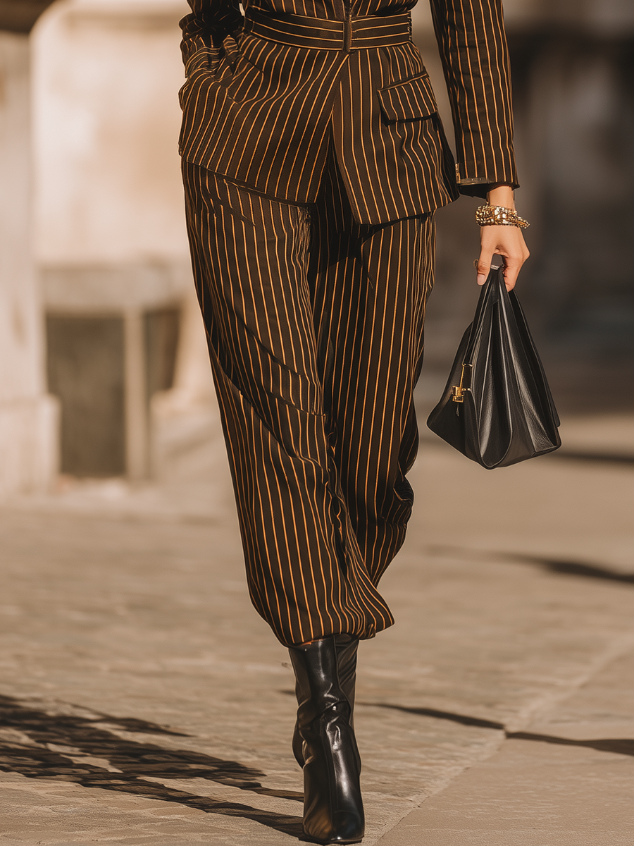 To style this elegant set, consider layering a neutral or complementary-colored blouse or shirt underneath the blazer for a classic and cohesive look. For footwear, opt for classic pumps or sleek loafers to maintain a polished appearance. A structured handbag or a chic clutch can complete the ensemble, adding functionality and style. Keep accessories simple yet refined—think minimalist jewelry such as thin hoop earrings, a delicate pendant necklace, or a sophisticated watch. For a modern twist, you can roll up the blazer's sleeves slightly or add a statement belt to cinch the waist. This elegant striped blazer and trousers set is perfect for those who want to convey confidence and style, no matter the occasion.