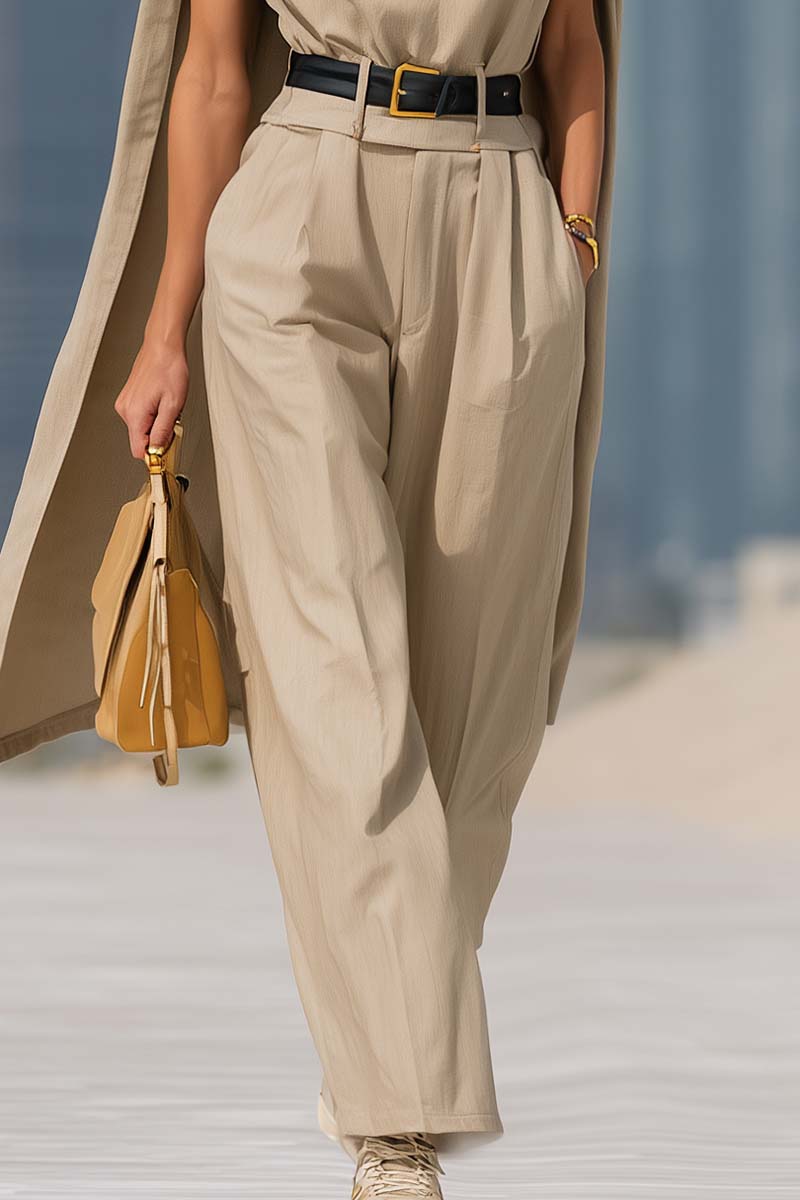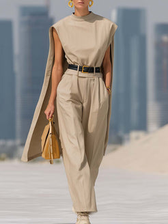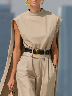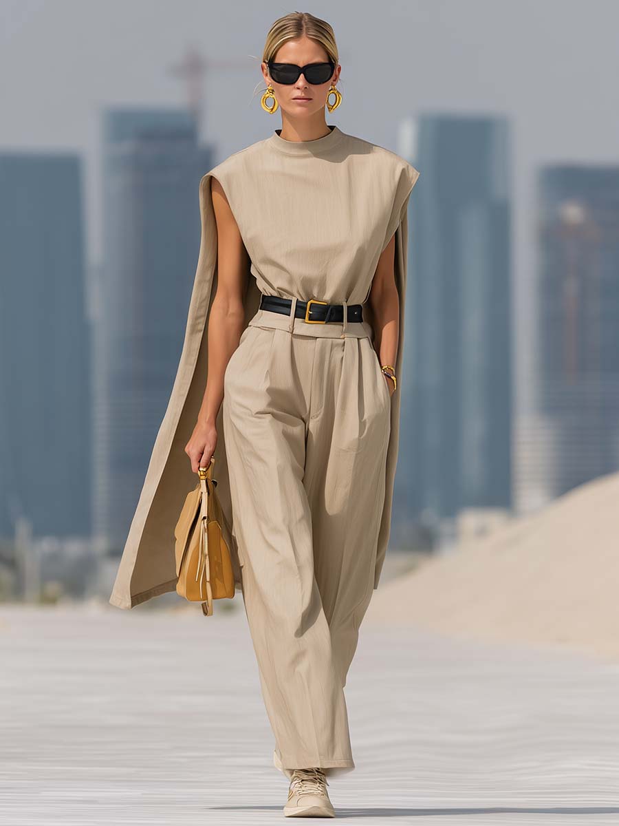 The Elegant Urban Khaki Small Stand-up Collar Sleeveless Cape Top And Pants Set is a sophisticated ensemble that effortlessly combines style with modern elegance. Featuring a unique sleeveless cape design, this set offers a chic and polished look, perfect for the contemporary fashion enthusiast. Crafted in a versatile khaki color, this outfit exudes a subtle yet commanding presence.