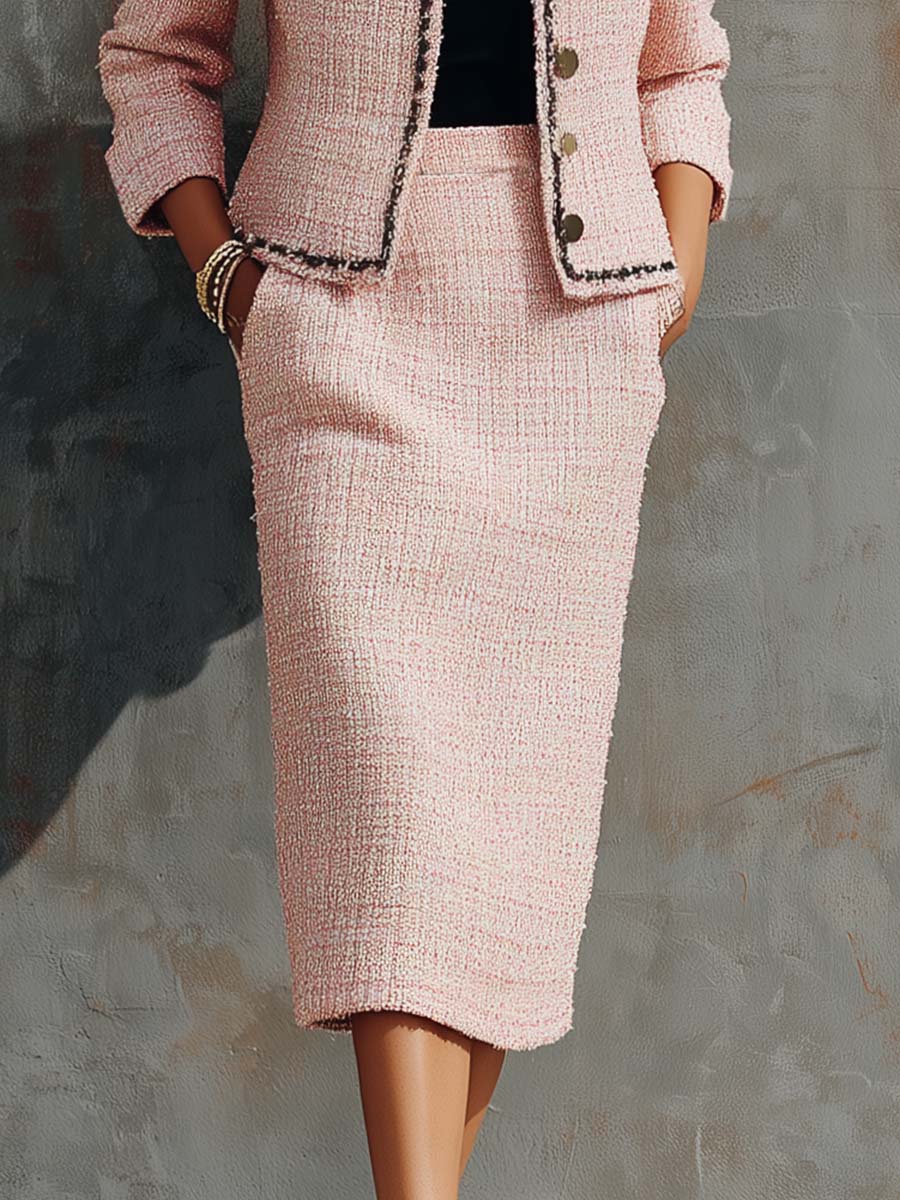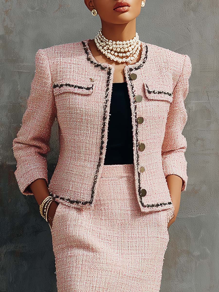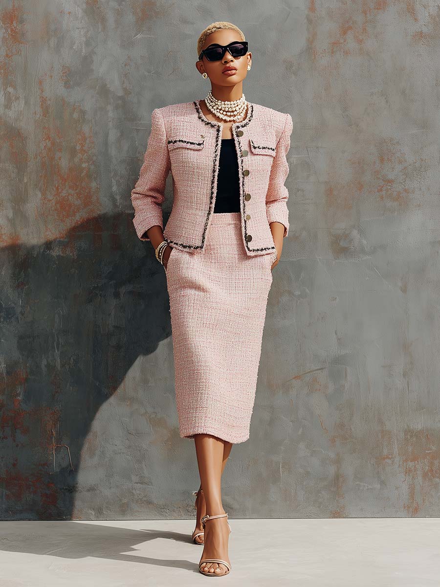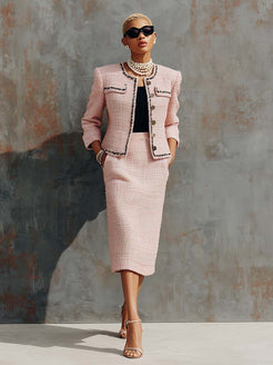The Exquisite And Fashionable Light Pink Tweed Jacket And Skirt Set is a stunning ensemble that combines elegance with a modern twist. Crafted from premium quality tweed, this set features a charming light pink hue complemented by striking black trim details. The round neck design and delicate front button closures add a touch of sophistication, making it perfect for both formal and semi-formal occasions.