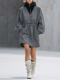 This exquisite Casual Black Contrast Stand Collar Hooded Gray Cotton Sweatshirt Style Mini Dress perfectly blends comfort with urban chic. The dress features a stylish stand collar with a hoodie for added versatility. This mini dress is crafted from soft, breathable cotton and offers a loose fit that ensures all-day comfort. The contrast between the black and gray hues adds a modern twist, making it a standout piece in any wardrobe.