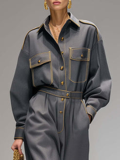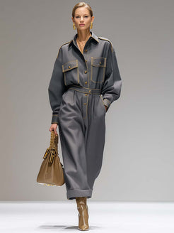 The Exquisite Casual Front Button Batwing Sleeve Waisted Gray Jumpsuit is an elegant blend of comfort and style. This chic piece features a sophisticated gray tone that exudes modern minimalism, making it the perfect addition to any fashion-forward wardrobe. The jumpsuit is tailored with a batwing sleeve design and a flattering waisted silhouette that enhances the body's natural curves while ensuring maximum comfort.
