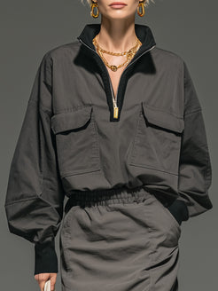 2.Design: Contrast lapels, front zipper, elastic waist, and cargo pockets.