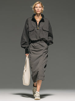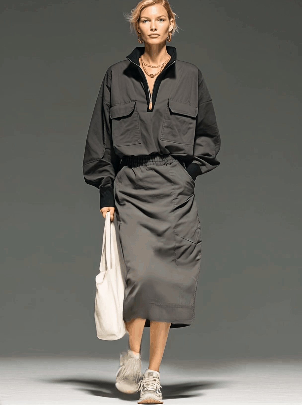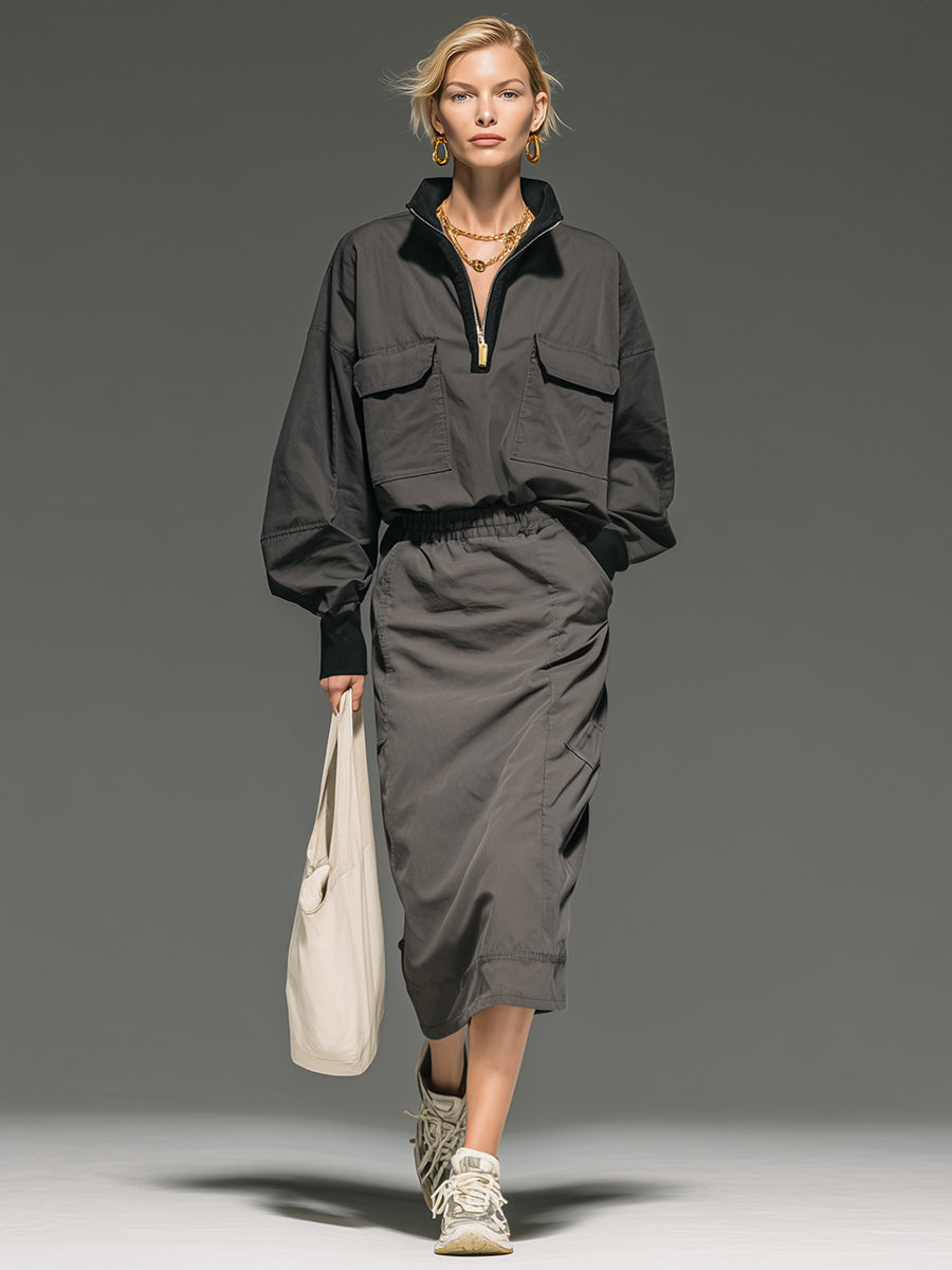 This Exquisite Casual Sports Street Contrast Color Lapel Front Zipper Elastic Waist Gray Midi Dress exemplifies modern elegance blended with sporty flair. Its unique design features a striking contrast color lapel and a practical front zipper that adds a touch of urban sophistication. Crafted with an elastic waist, this midi dress provides both style and comfort, making it an ideal choice for every occasion.