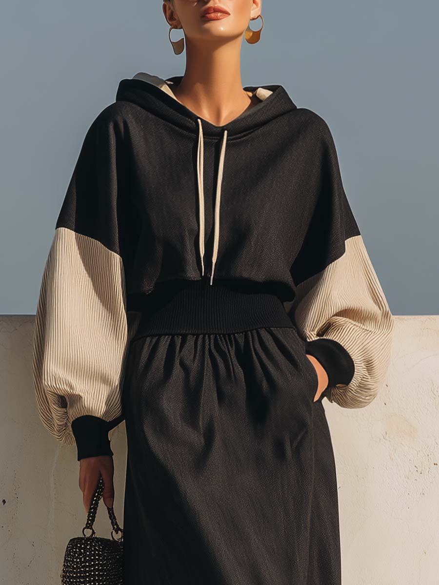 Introducing the Exquisite Casual Sports Street Hooded Maxi Dress, a chic and versatile piece that effortlessly combines comfort with style. The dress features a unique color-blocking design with beige sleeves and a black main body, offering an exquisite look that is ideal for casual outings or sporty occasions. Constructed from premium quality cotton, this dress promises a soft and breathable experience, perfect for any season.