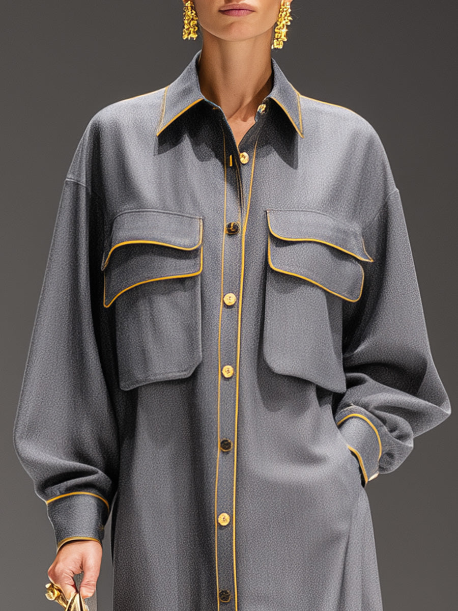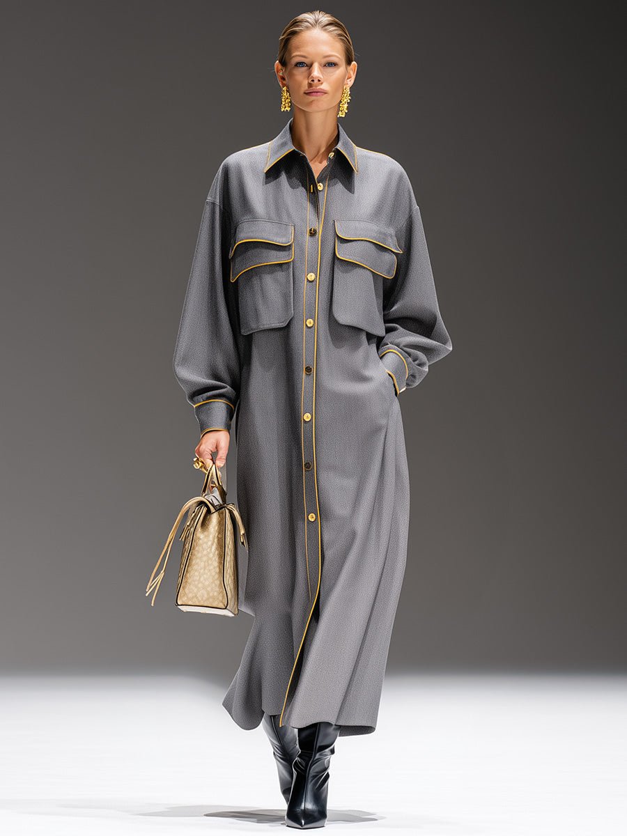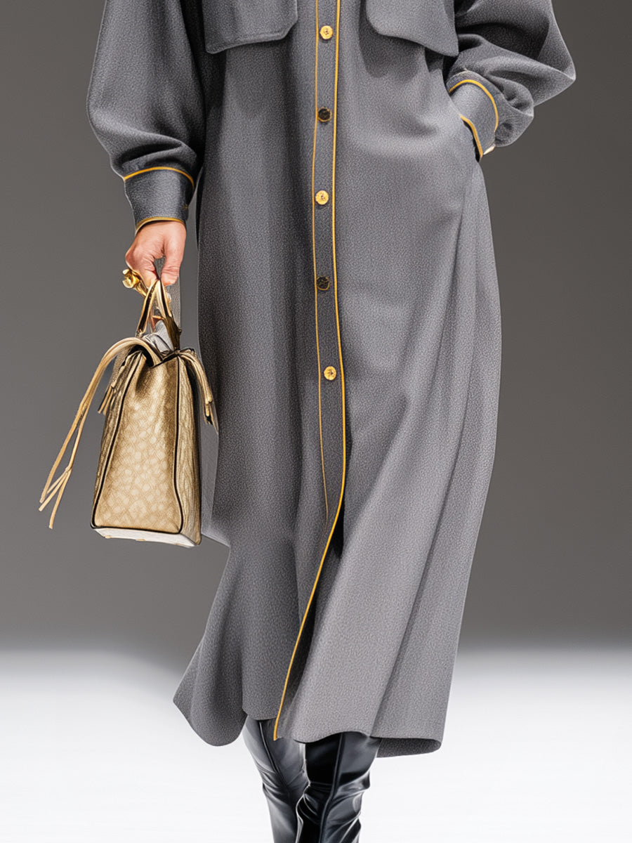 The "Exquisite Casual Streamlined Tailoring Yellow Trim Front Button Gray Maxi Dress" is a perfect blend of elegance and comfort. Its sleek design is accentuated by a sophisticated gray hue, while the yellow trimming offers a touch of vibrancy, making it both eye-catching and classy.