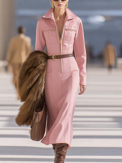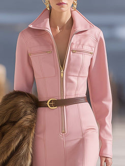 Exquisite Casual Versatile Lapel Front Zipper Belt Pink Maxi Dress