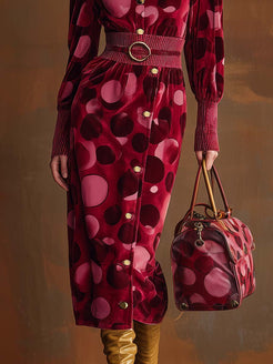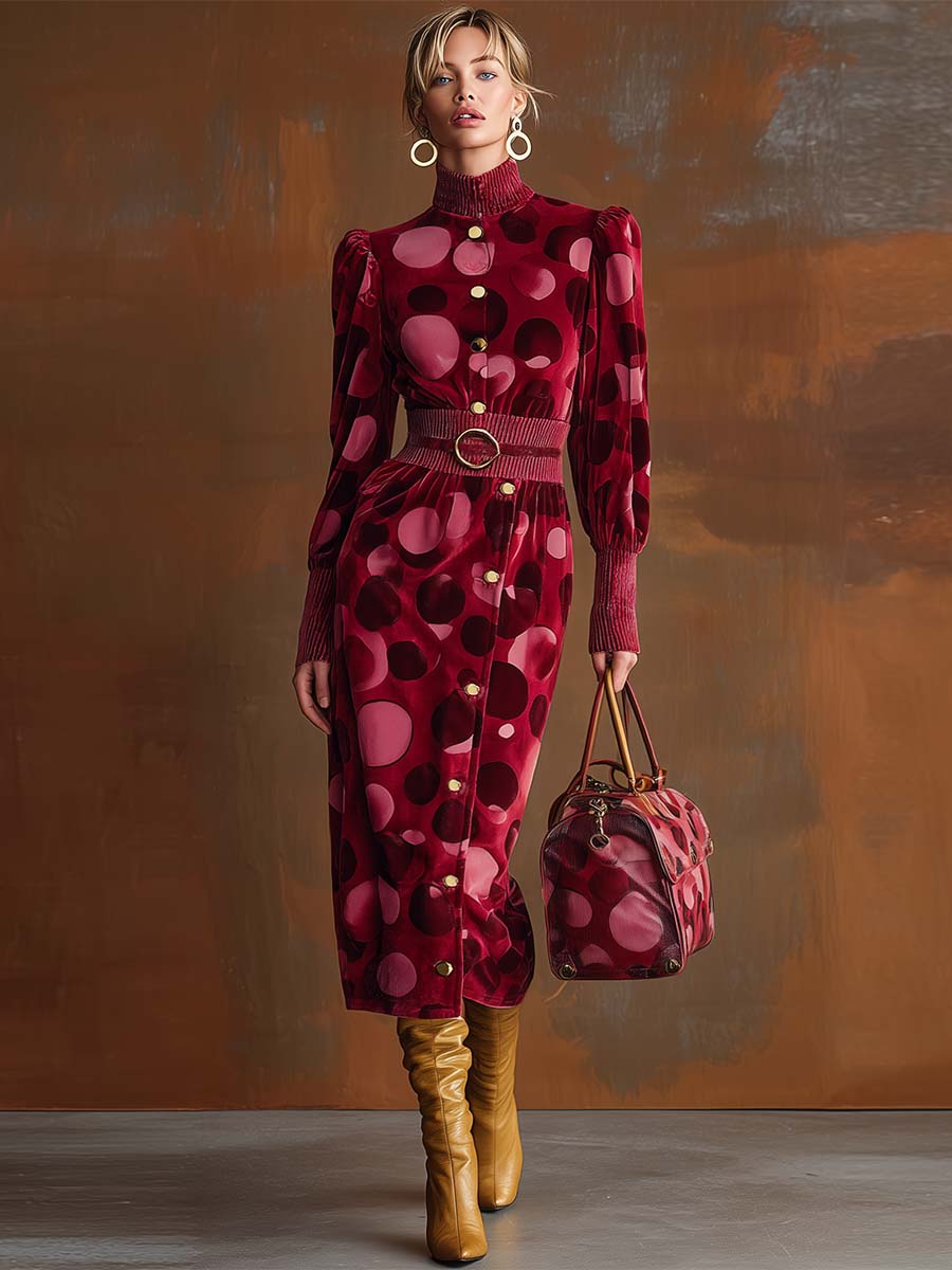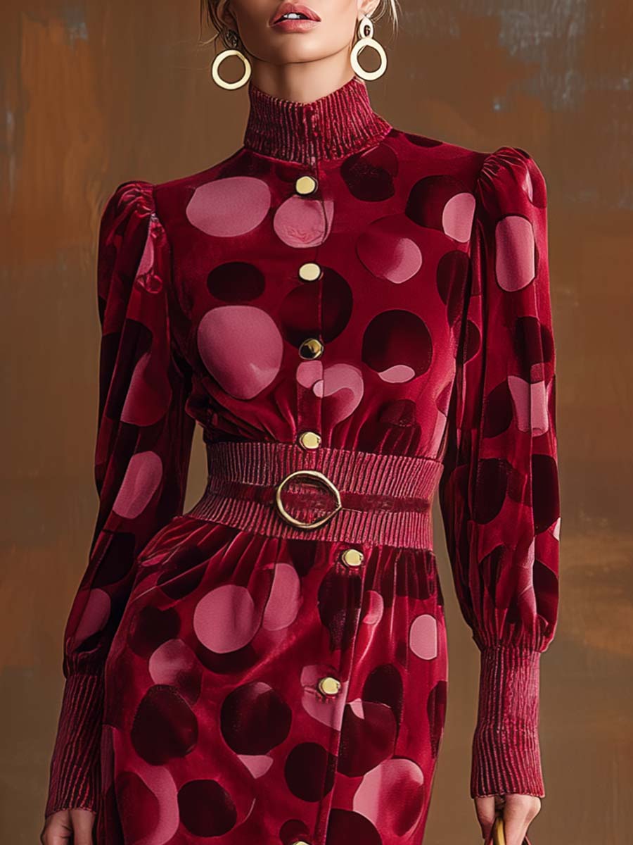The Exquisite Retro Fashion High Collar Bubble Shoulder Burgundy Velvet Polka Dot Print Slit Midi Dress is a stunning combination of vintage elegance and contemporary style. Crafted from luxurious velvet fabric, this dress features a rich burgundy hue adorned with playful polka dots. The design is completed with a high collar and distinctive bubble shoulders, offering a structured yet feminine silhouette. A subtle slit at the midi length hem adds a modern touch and facilitates ease of movement.
