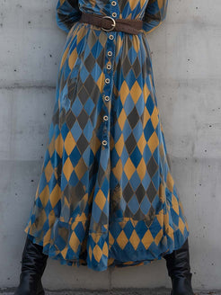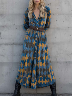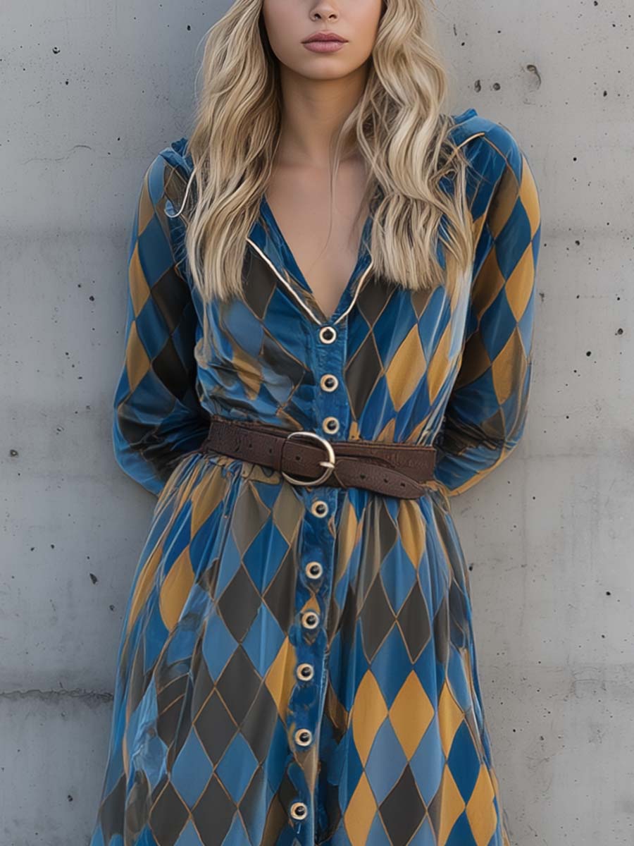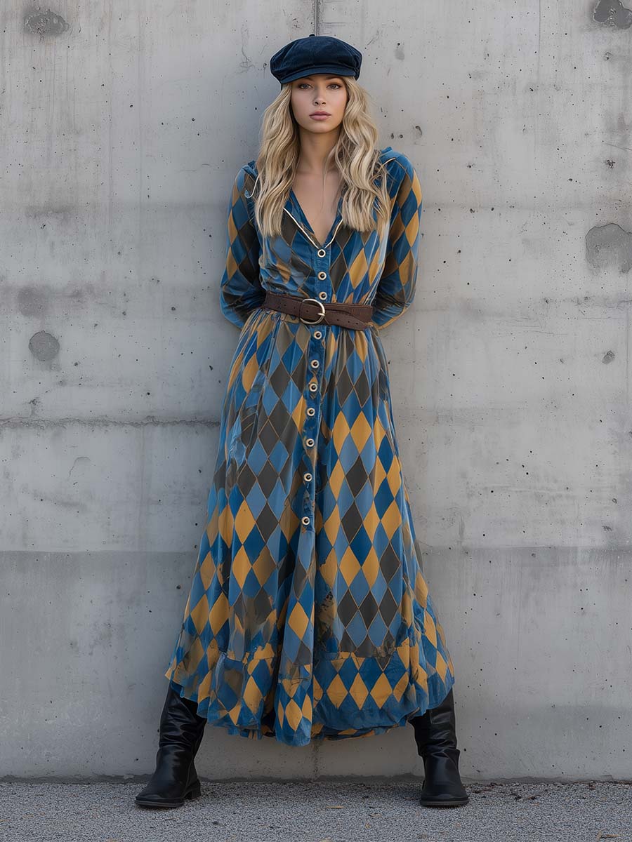 This exquisite Retro V-neck hooded dress features a timeless Blue and Yellow Diamond Check Print, crafted from luxurious velvet fabric. The dress is designed with a sophisticated strong V-neckline and detailed front buttons, offering a classic yet modern appeal. Its full-length maxi silhouette provides an elegant and flowing drape, making it perfect for a variety of occasions.