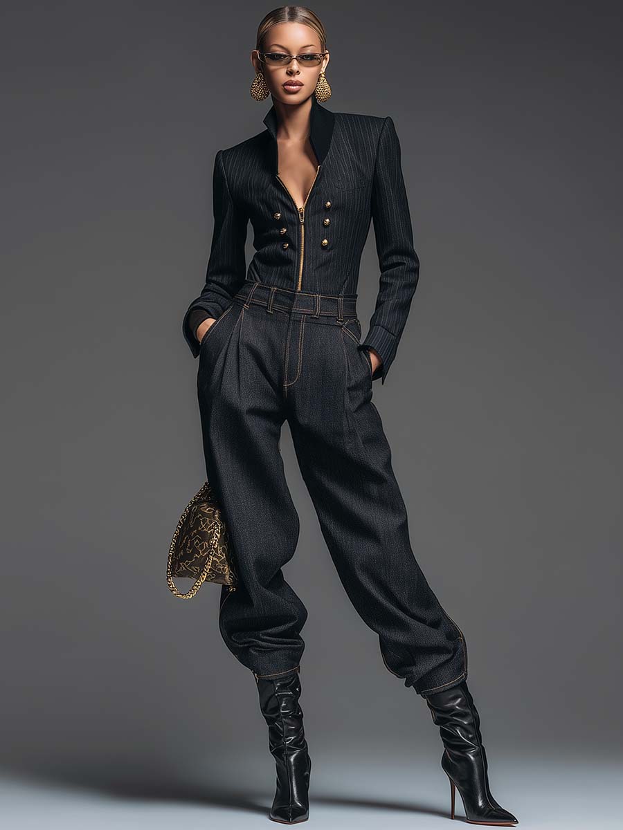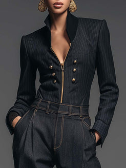 The Exquisite Urban Contrast Color Stand Collar Front Zipper Metal Decoration Black Striped Slim Jacket is a perfect blend of modern style and classic elegance. With a form-fitting silhouette, this jacket exudes sophistication while maintaining a contemporary edge.