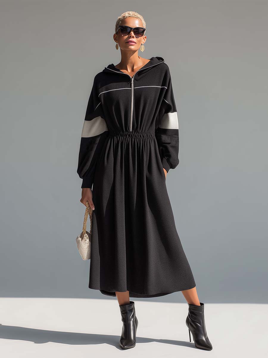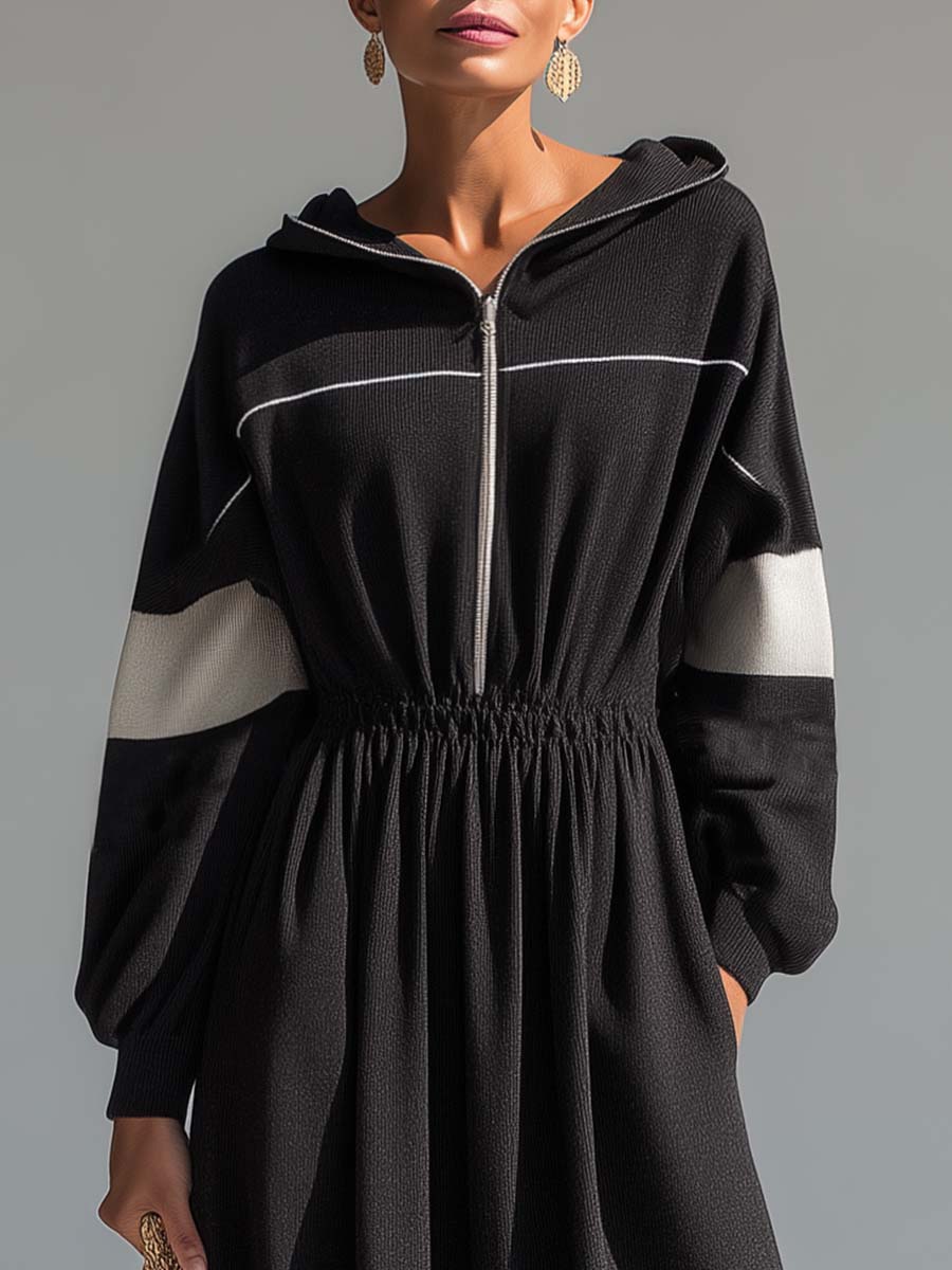 The Exquisite Urban Sporty White Contrast Black Stretch Knit Hooded Front Zipper Maxi Dress is a modern and stylish garment designed for those who want to make a bold fashion statement. This dress features a sporty aesthetic combined with urban elegance, making it perfect for a versatile look.