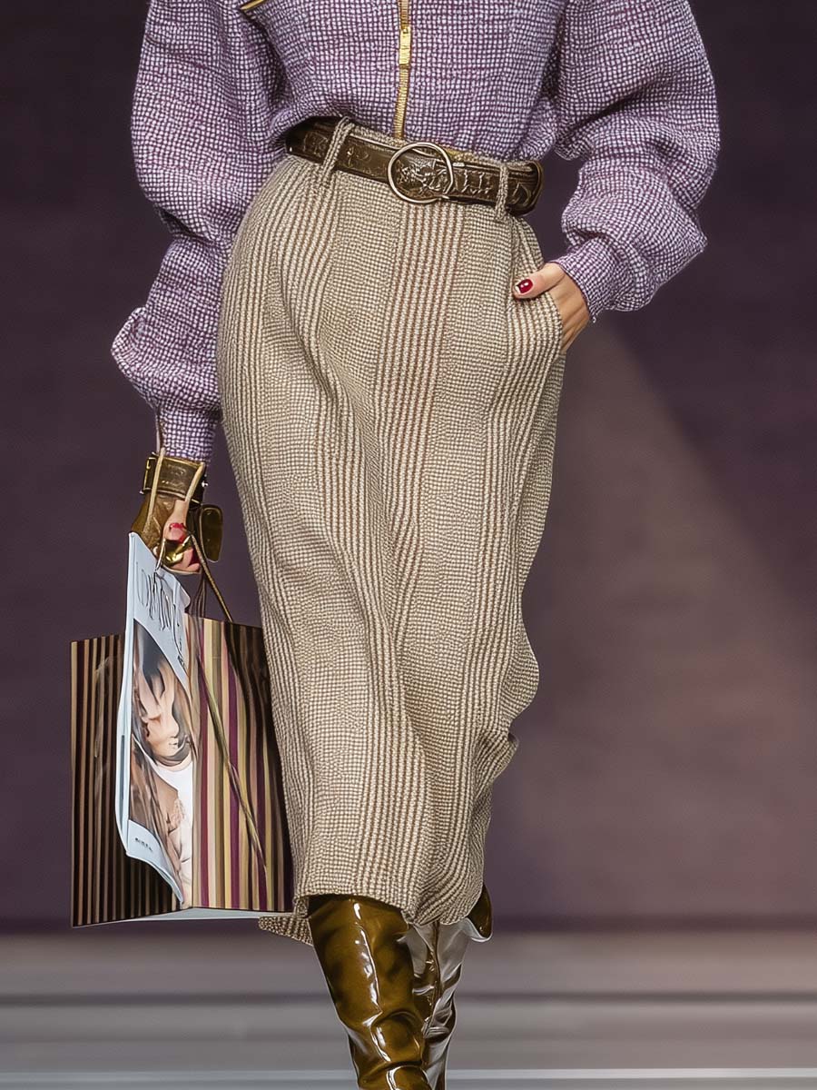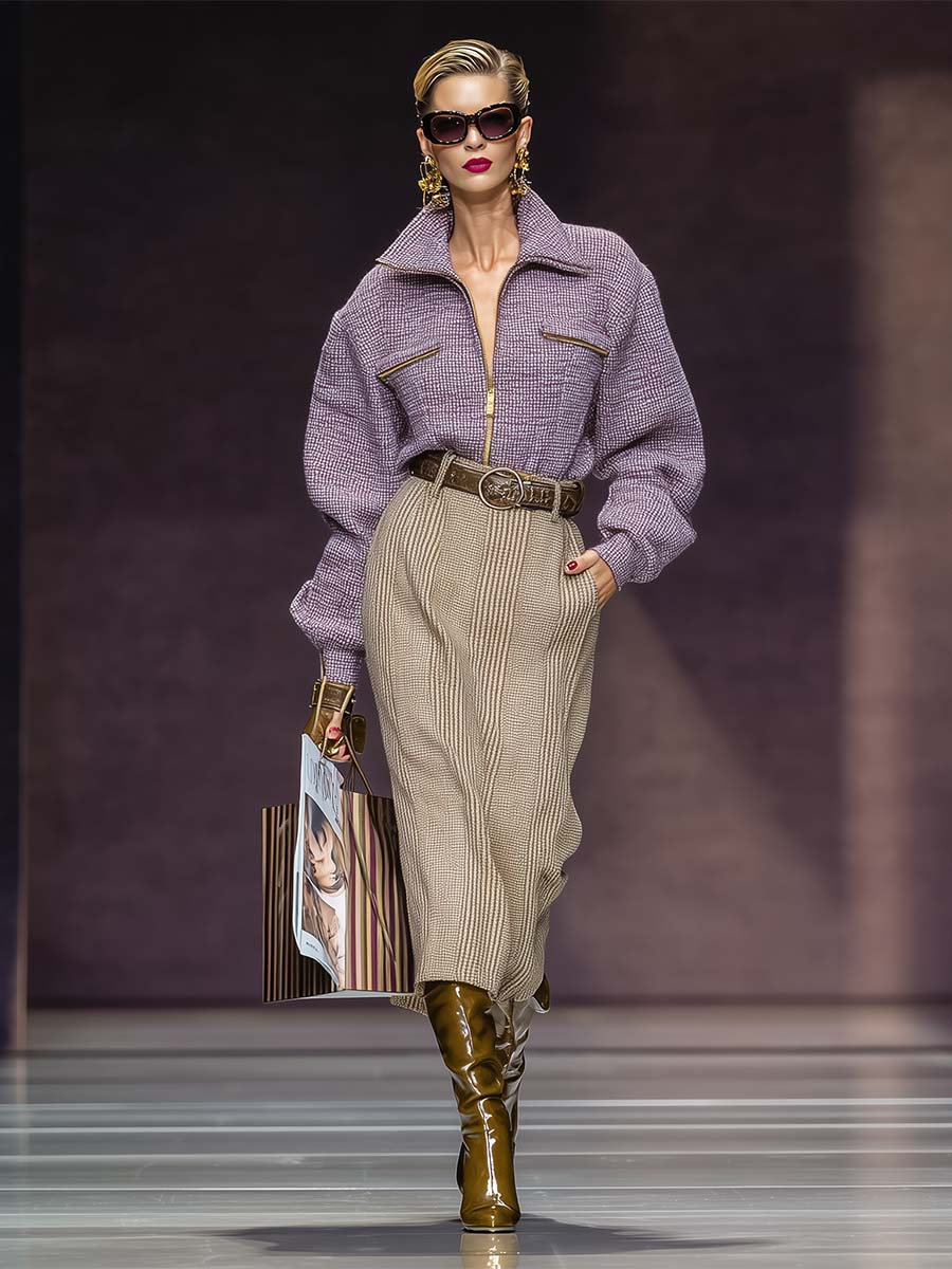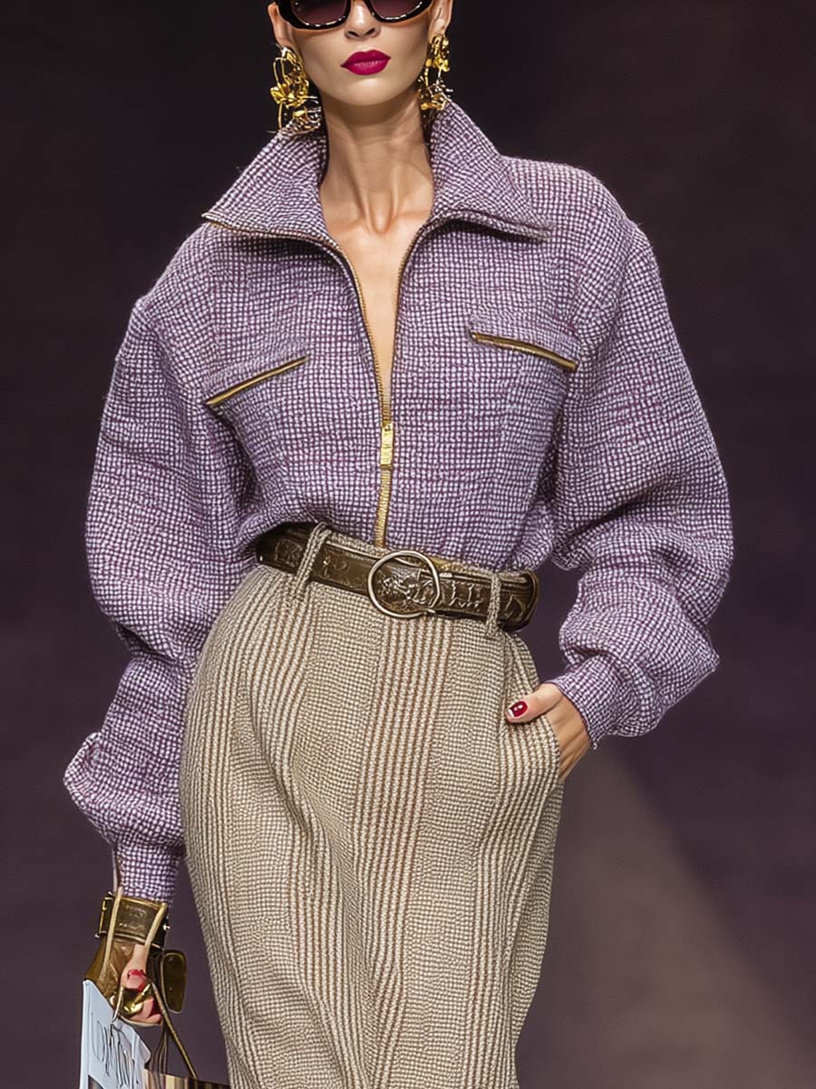 The Exquisite Vintage Purple Tweed Lapel Front Zip-up Top and Beige Plaid Skirt Set is a timeless ensemble that brings together classic style and modern elegance. This two-piece outfit includes a sophisticated top and a striking plaid skirt, which together create a harmonious and fashionable look.