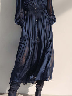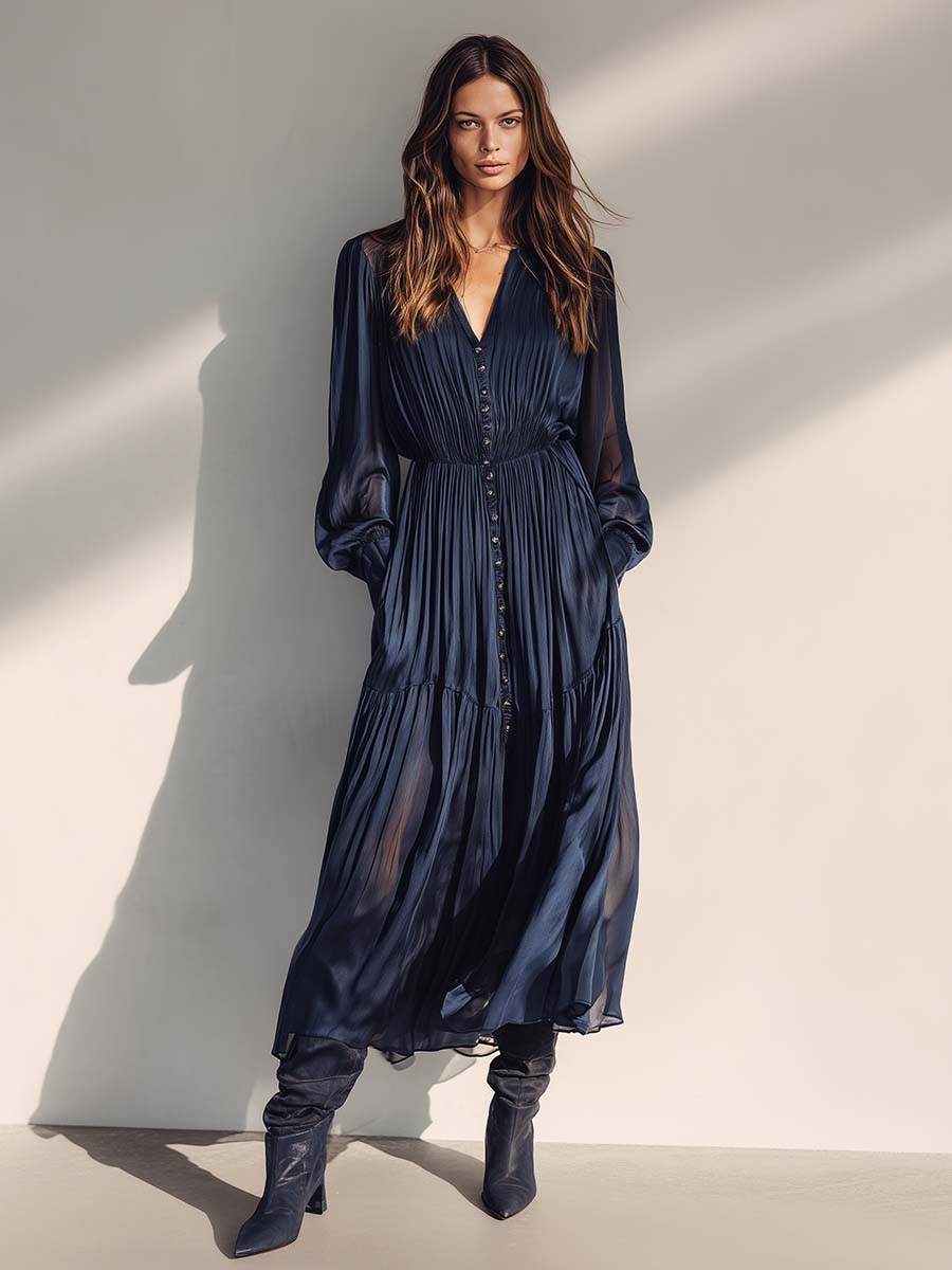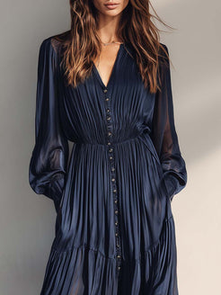 The Fashion Flowing V-neck Front-button Sheer Long-sleeved Dark Blue Organza Midi Dress is a perfect embodiment of elegance and sophistication. It features a distinctive V-neck design and front-button closure, which adds an element of timeless style to the garment. The dress is crafted from high-quality organza material that provides a delicate and flowing silhouette.