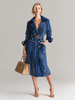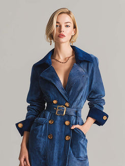 This stylish vintage blue corduroy long-sleeved tie-down midi trench coat combines soft texture, rich color, and timeless design to create a striking and versatile piece. Add a touch of luxury and vintage charm to your wardrobe.