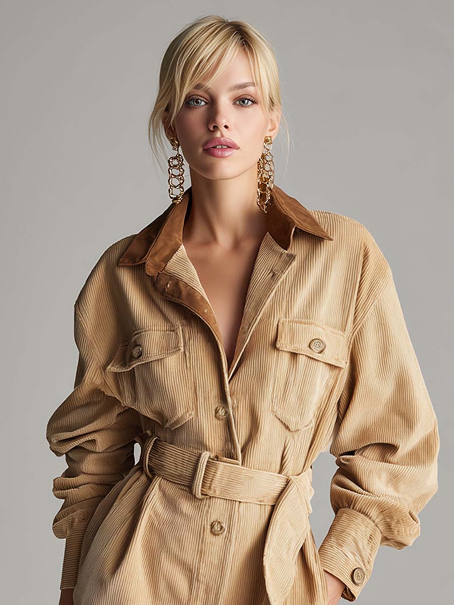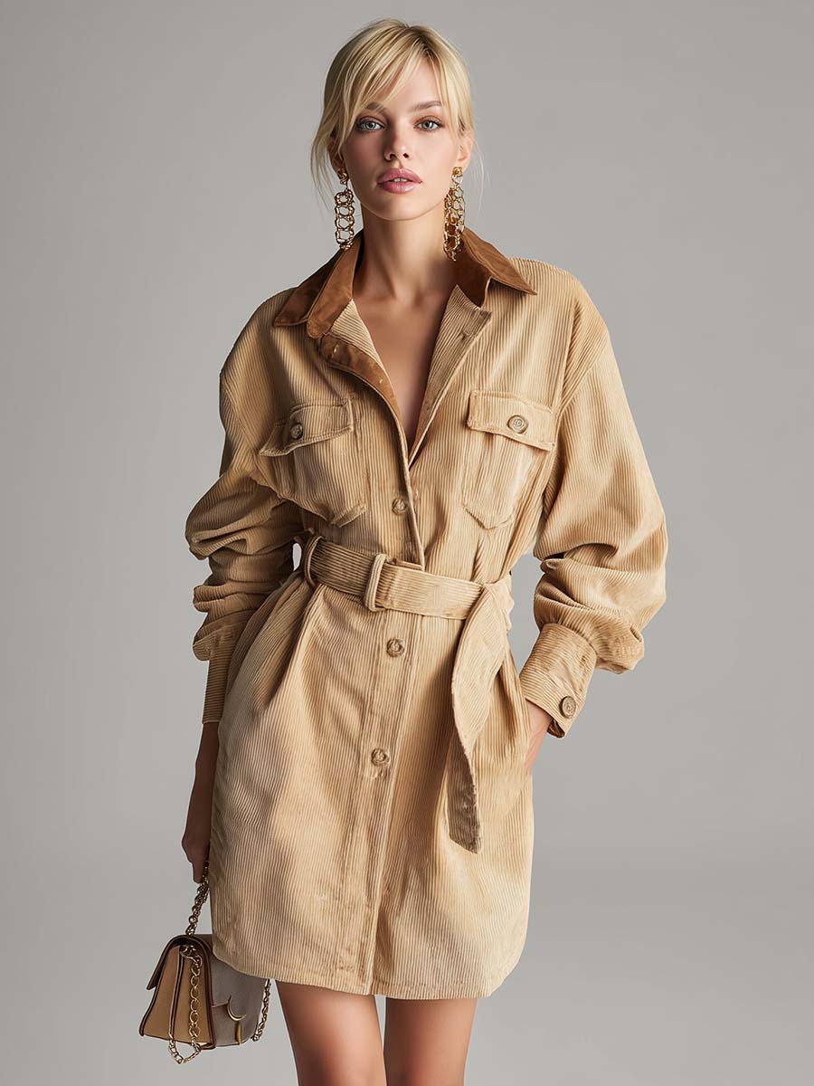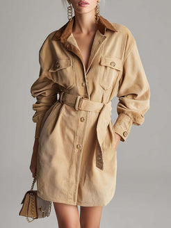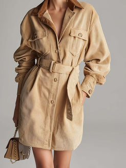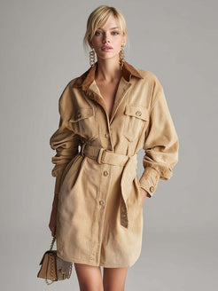 This stylish, vintage-inspired coffee corduroy long-sleeved tie midi dress combines soft texture, rich color, and timeless design for a striking and versatile piece. Crafted from silky faux suede in a striking coffee hue, this dress adds a touch of luxurious texture and vintage charm to your wardrobe.