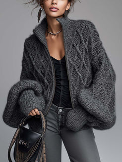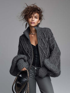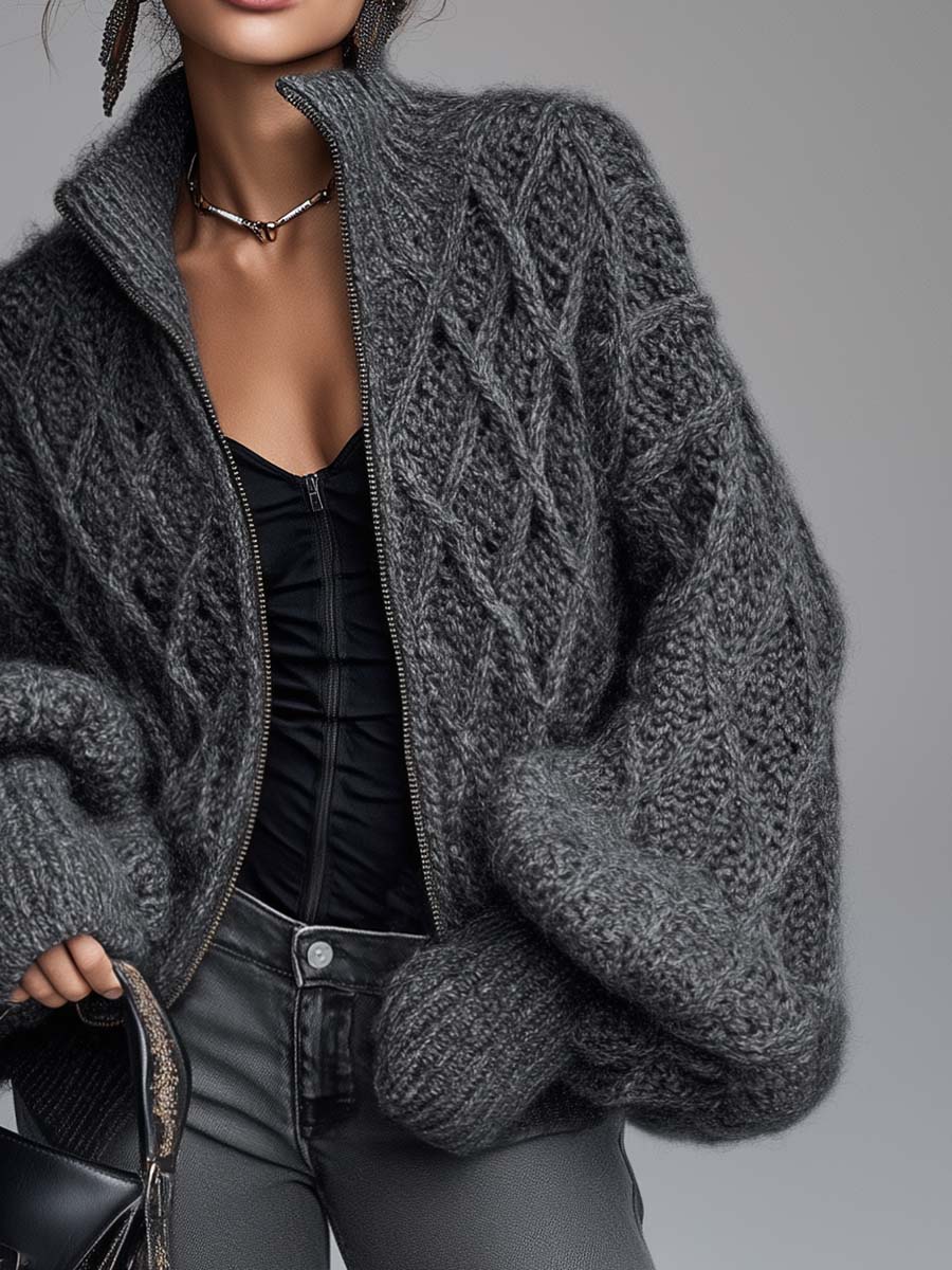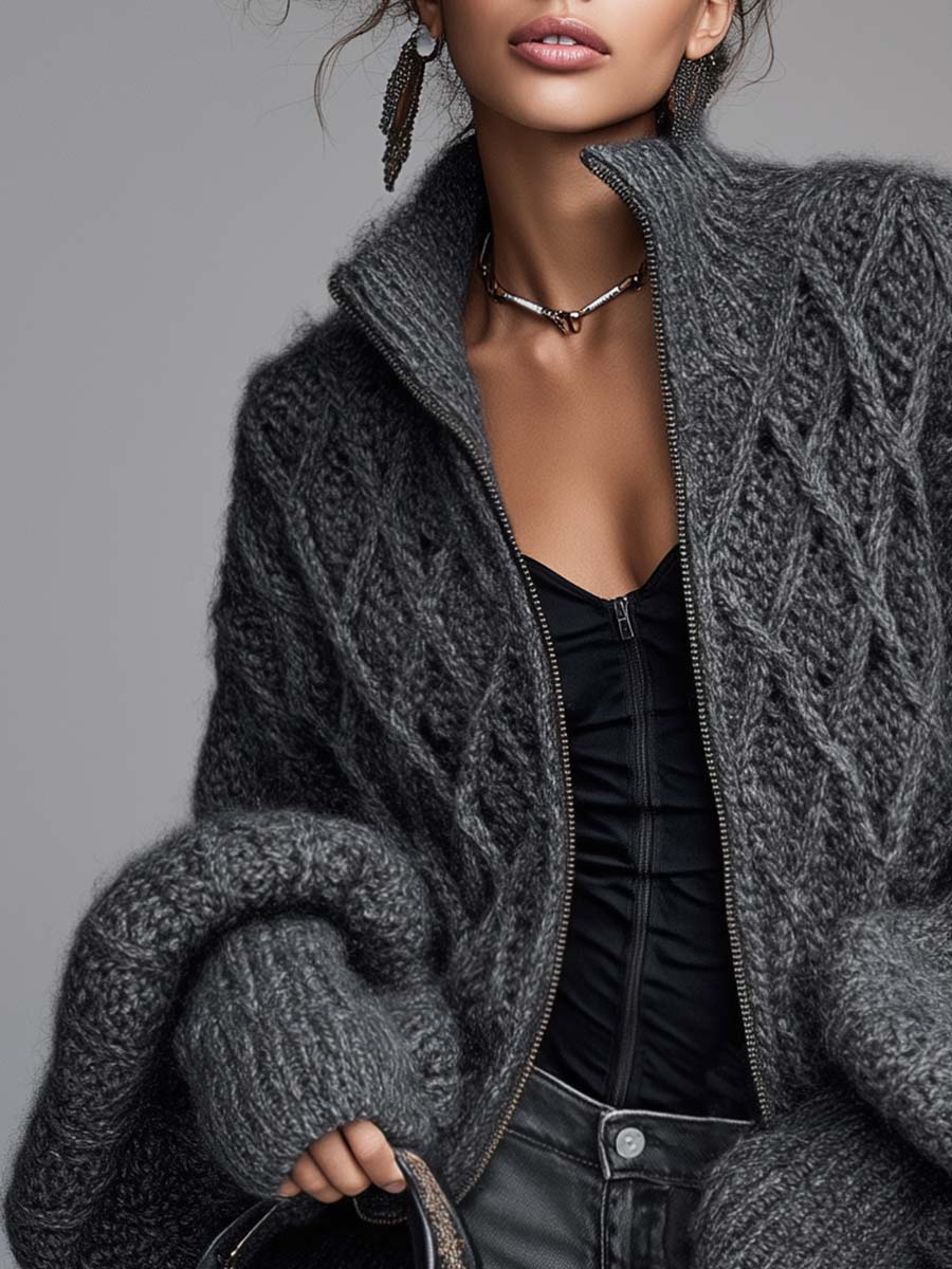 This Fashionable and Versatile Stand-up Collar Front Zipper Knitted Cardigan is the epitome of style and comfort. Crafted in a dark gray hue, it features a unique diamond check texture that gives it a distinct and sophisticated appearance. The stand-up collar provides an elegant touch, while the front zipper allows for easy wear and versatility in styling.