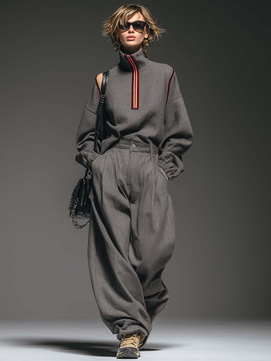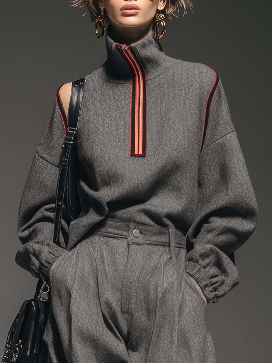 This Fashionable Gray Cotton Turtleneck Front Zipper Off-shoulder Long-sleeved Top And Pants Set is a stylish and contemporary ensemble perfect for modern wardrobes. The set features a sleek design with a unique front zipper that adds a touch of versatility and flair, ensuring you stand out wherever you go.
