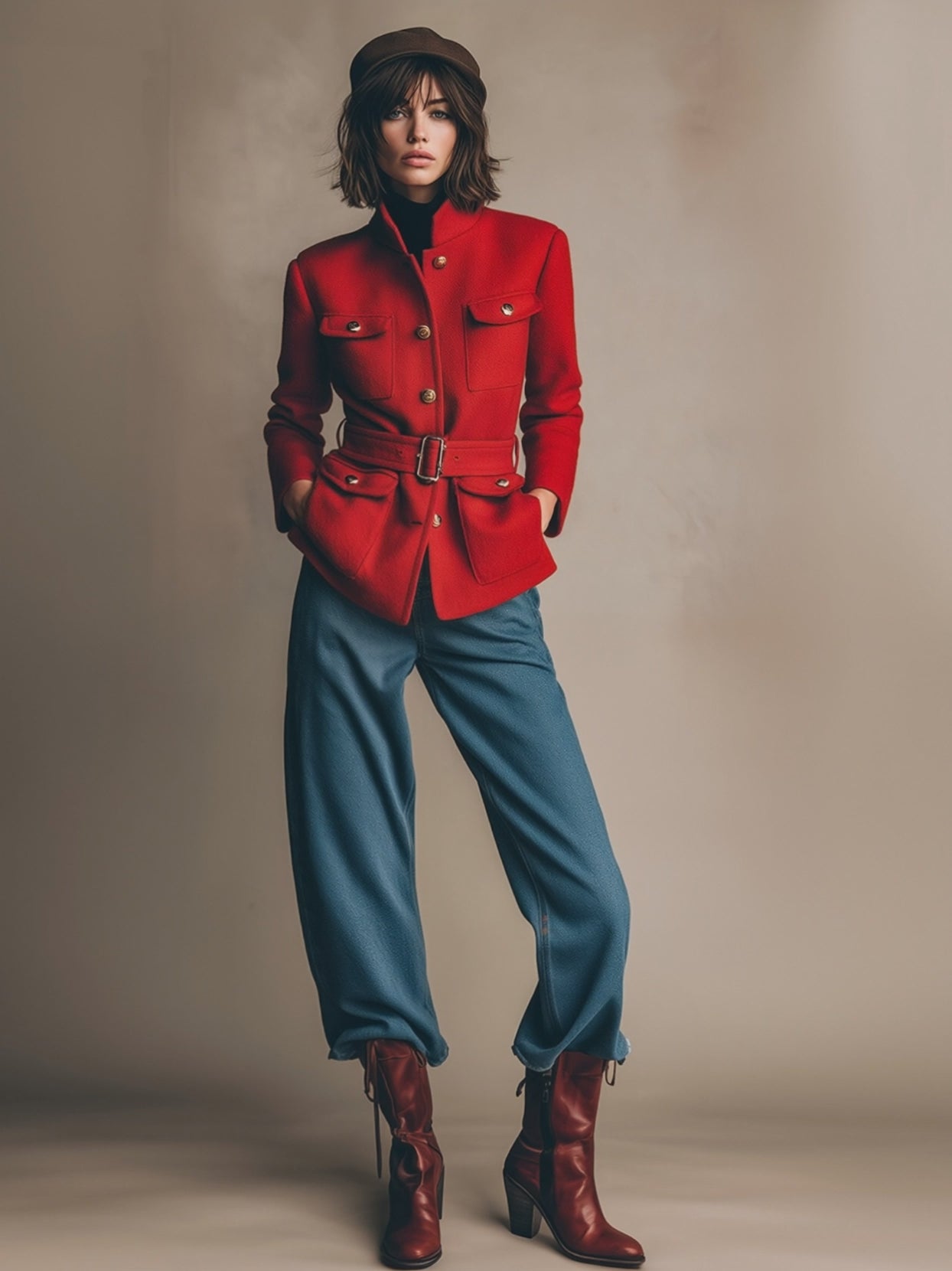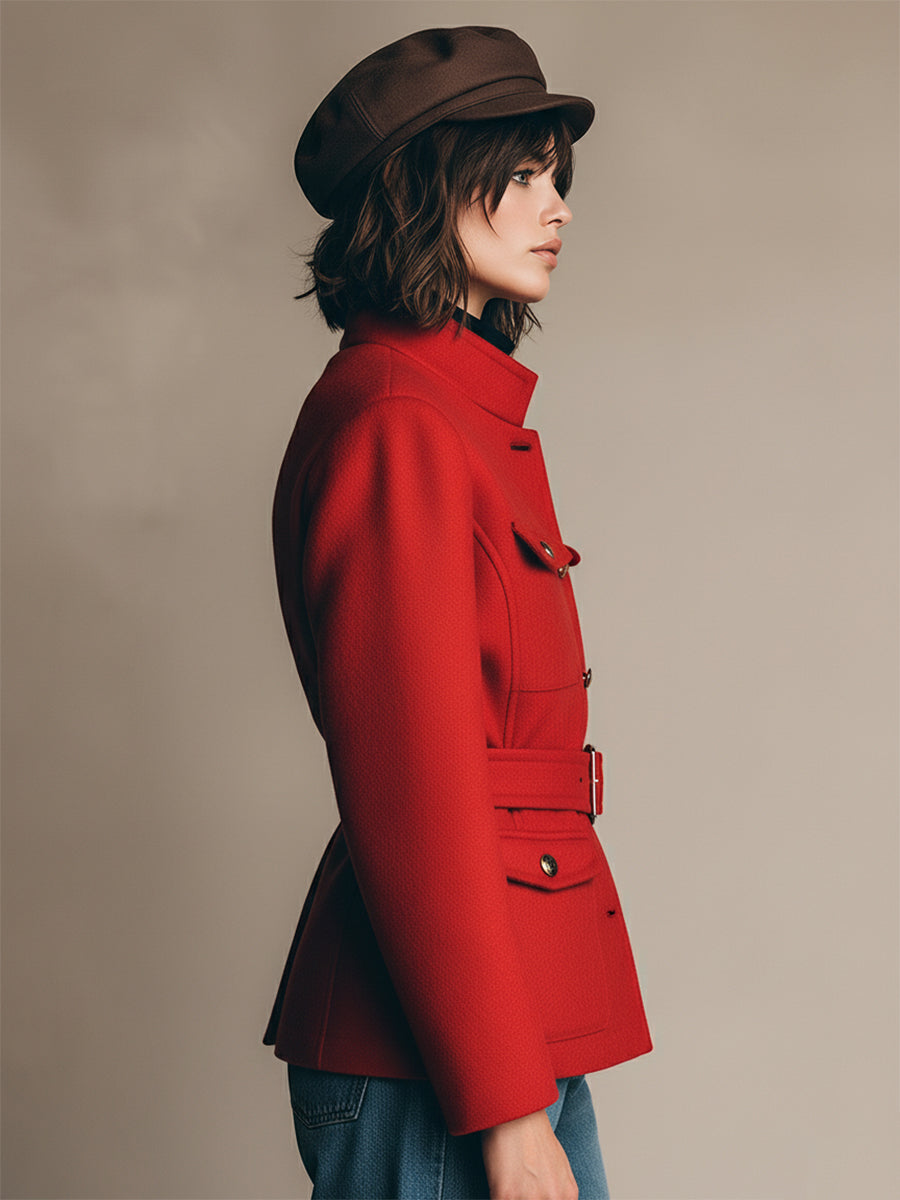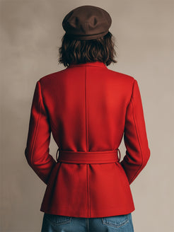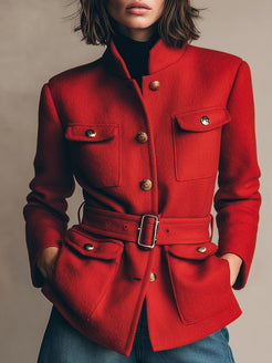 The Fashionable Retro Workwear Belt Red Woolen Jacket is a perfect blend of vintage utility and contemporary style. Made from high-quality red wool, this jacket features a workwear-inspired design with a structured, slightly oversized fit that exudes both toughness and style. The standout feature is the adjustable belt at the waist, which cinches the jacket for a more tailored silhouette, giving it a modern twist while maintaining its functional, utilitarian roots. With large, practical pockets and sturdy buttons, it carries that classic workwear charm, but in a polished, chic form.