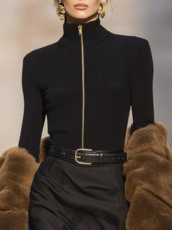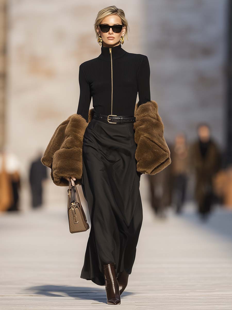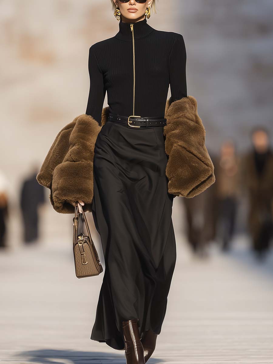 This Black Knitted Front Zip Top and Maxi Skirt Set exemplifies the perfect blend of sophistication and versatility. The ensemble is designed for modern fashion enthusiasts who value both style and comfort. The top features a chic front zipper, allowing for adjustable styling and added convenience. The maxi skirt is flowy and elegant, enhancing the overall graceful silhouette of the set.