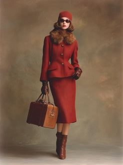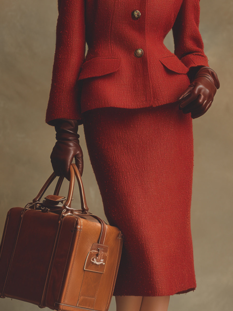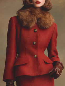 Complementing the jacket is a tailored skirt that harmoniously balances the ensemble. The skirt is designed to create a flattering silhouette, often featuring a pencil or A-line shape that elegantly skims the body. Its length allows for versatility in styling, making it suitable for both professional settings and upscale events. Together, this suit can be accessorized with statement heels and elegant jewelry for a truly refined look or dressed down with ankle boots for a more relaxed yet stylish outfit. The High-End Fashionable Faux Fur Collar Red Tweed Jacket and Skirt Suit offers a sophisticated blend of textures and colors, making it a standout choice for anyone looking to make a bold fashion statement while enjoying timeless elegance.