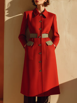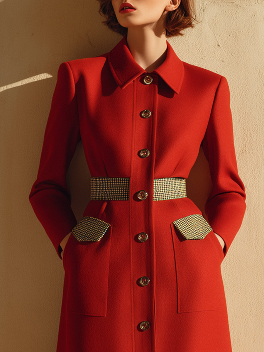 The High-End Fashionable Gold Ribbon at Waist Red Woolen Coat is an elegant outerwear piece that seamlessly fuses contemporary design with classic charm. Made from luxurious wool, this coat not only provides warmth during the colder months but also features a striking red hue that adds a vibrant pop of color to any wardrobe. The standout element of this coat is the exquisite gold ribbon cinched at the waist, which not only accentuates the silhouette but also introduces a touch of sophistication and flair, setting this coat apart from traditional styles.