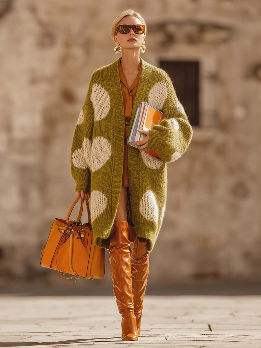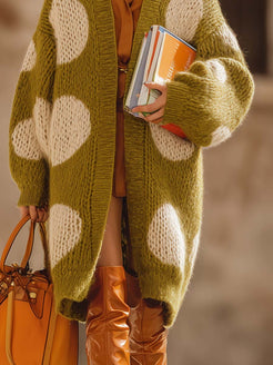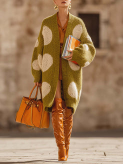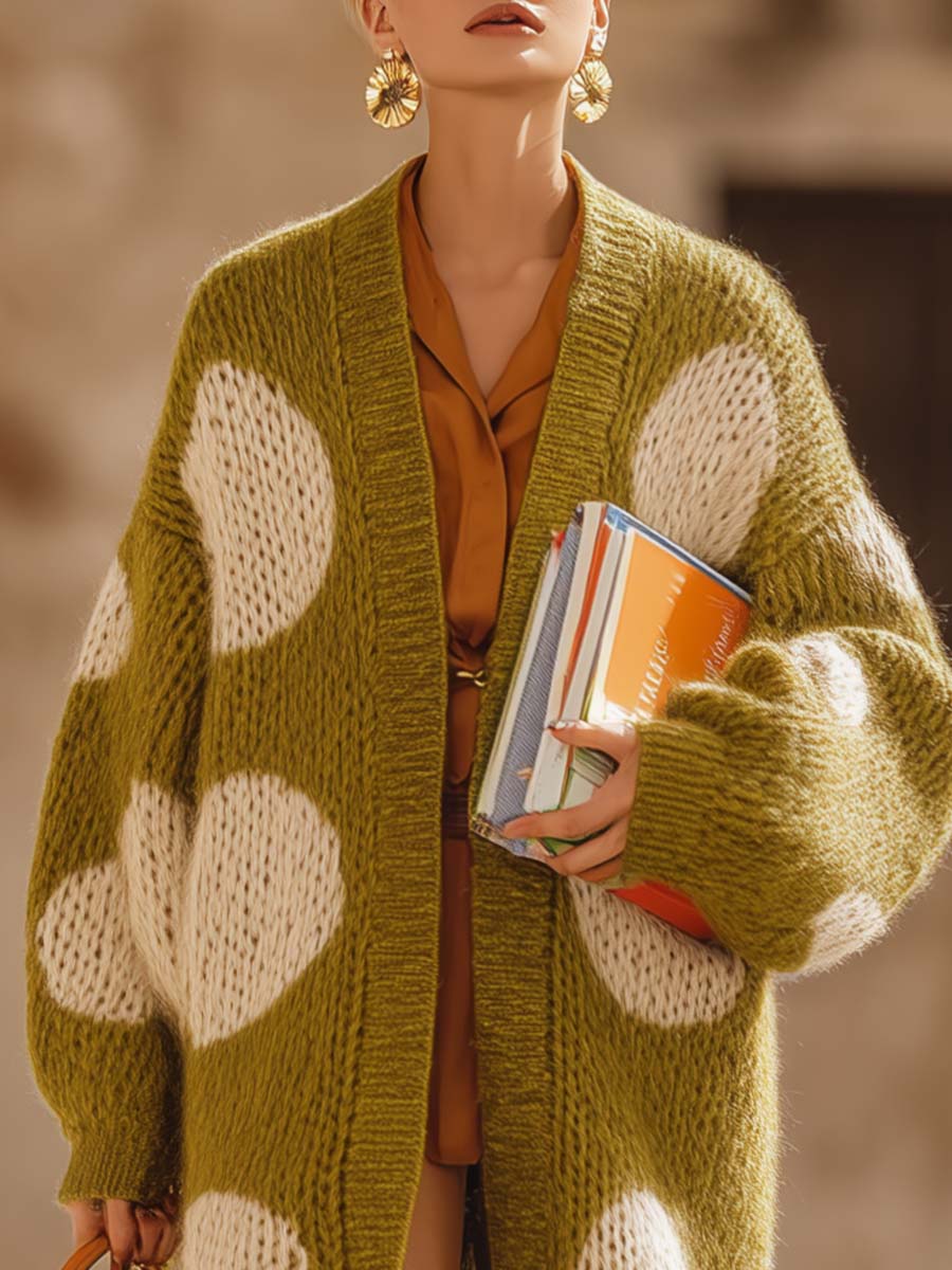 This Retro Urban Green and White Polka Dot Knitted Cardigan is a delightful blend of vintage charm and modern style. The playful polka dot pattern, set against a sophisticated green hue, creates a striking yet elegant look. Made from high-quality knitted fabric, this cardigan is soft, cozy, and perfect for dressing up or down.